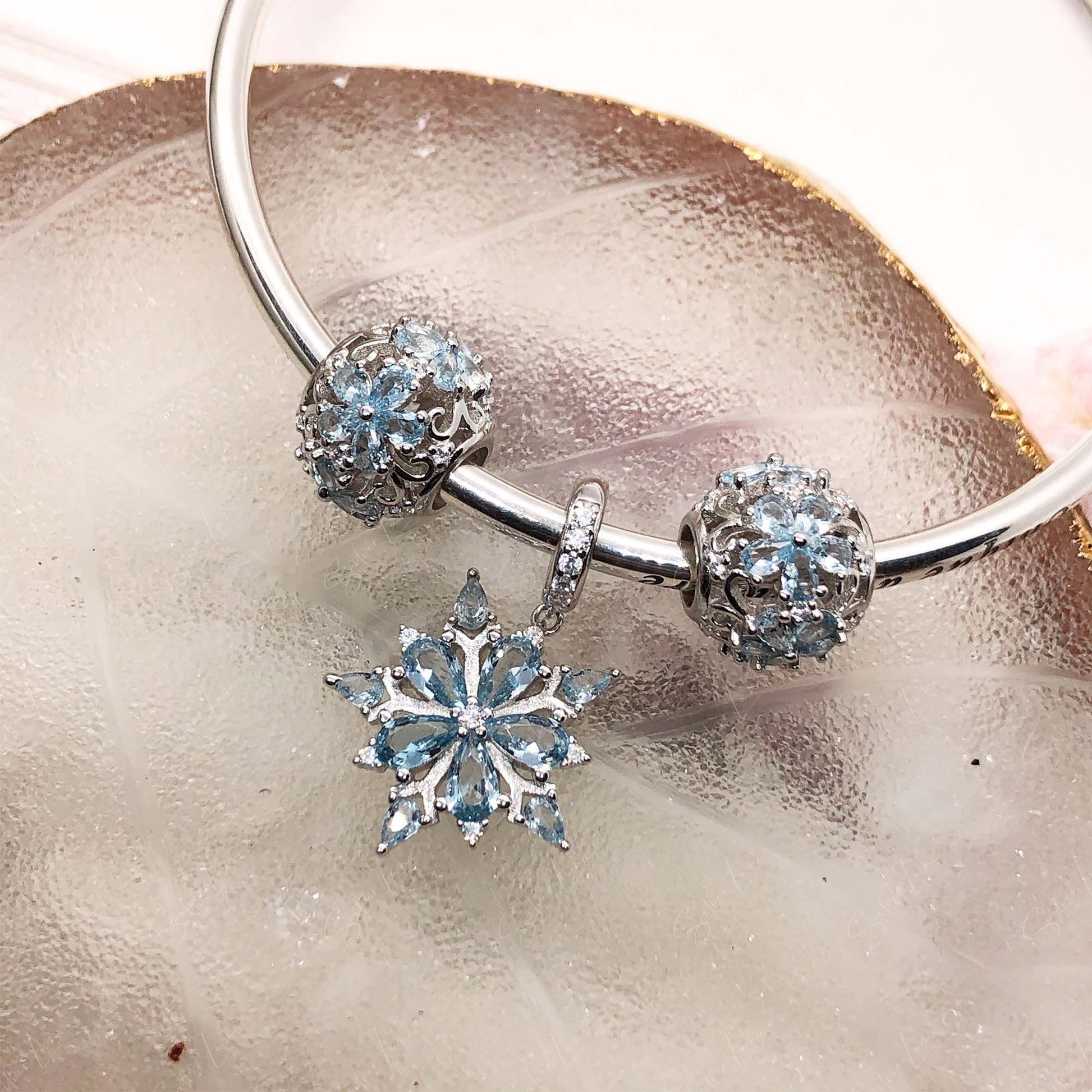 Charms are made of solid 925 sterling silver with light blue cubic zirconia gemstone decorations, snowflake flower design, these snowflake charms will be a perfect gift for your love one this holiday season. Add a touch of elegance and sparkle to any bracelet or necklace with these beautiful snowflake charms. Made from high-quality sterling silver and adorned with light blue cubic zirconia gemstones, they are the perfect way to show someone you care this holiday season. Whether as a gift for a loved one or to treat yourself, these charming snowflake decorations are sure to bring joy and beauty to any piece of jewelry.