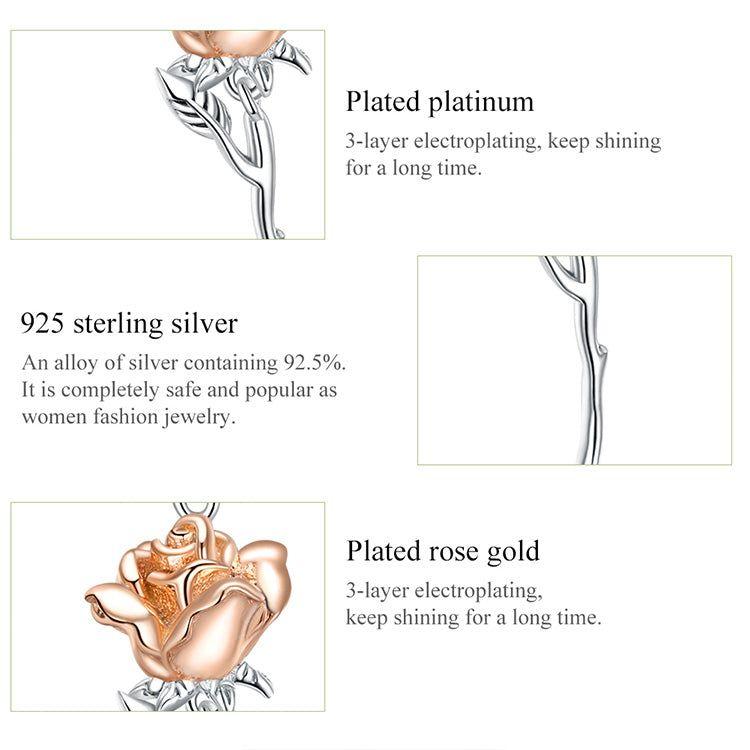 This exquisite rose pendant necklace showcases a 3D rose in 925 sterling silver with rose gold plating for a stunning flower color. It hangs delicately on a 925 sterling silver cable pendant with an adjustable ball. Make this elegant rose pendant necklace a part of your everyday fine jewelry collection, or gift it to a loved one for a special occasion.