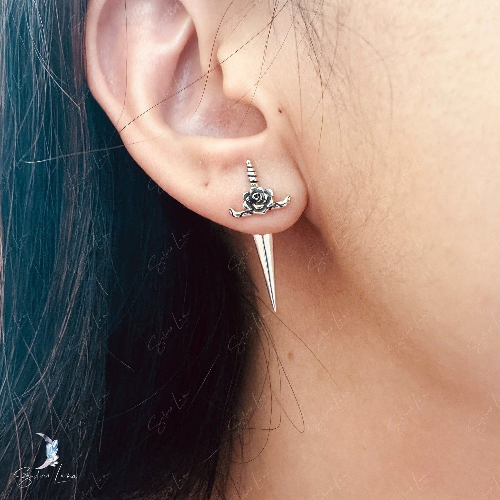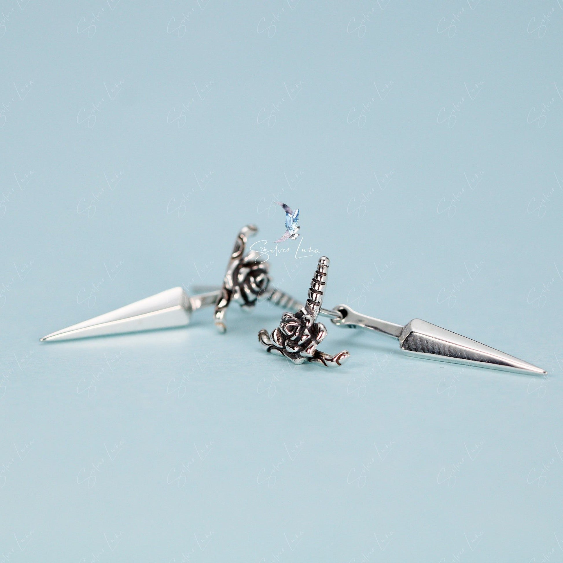 These elegant rose and sword or dagger earrings feature a rose sword handle and the sword blade ear jacket. They are made from solid 925 sterling silver with platinum plating and oxidation darkening process to give them contrast and great details. Transform your outfit with these stunning earrings! The intricate design of a rose and sword or dagger adds a touch of elegance and edginess. Each earring is crafted from high-quality solid 925 sterling silver with platinum plating and an oxidation darkening process, creating a beautiful contrast and highlighting every detail. Elevate your style with these unique and eye-catching earrings!