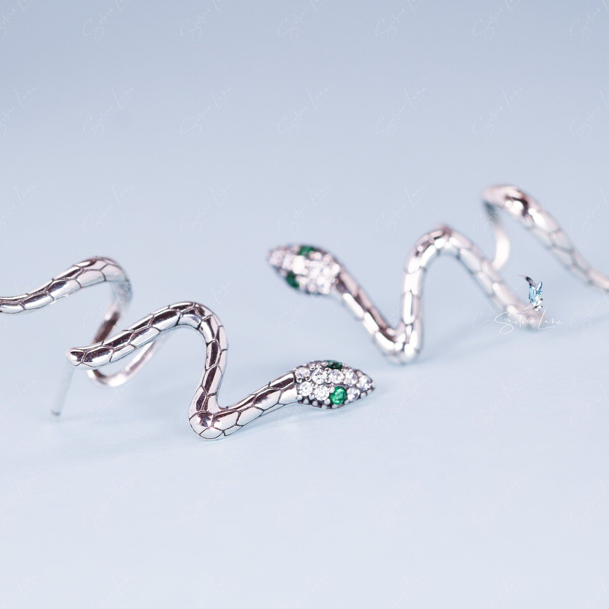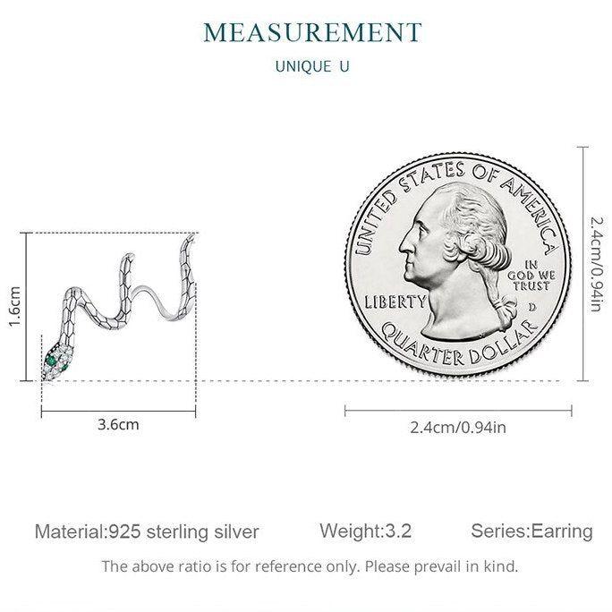 Upgrade your jewelry collection with these stunning snake wrap stud earrings! Made of solid 925 sterling silver and platinum plating, these earrings feature a detailed design of a snake with mesmerizing green eyes. Add a touch of bohemian style to your everyday look or give them as a perfect gift to your special someone. Don't miss out on these unique and charming earrings!