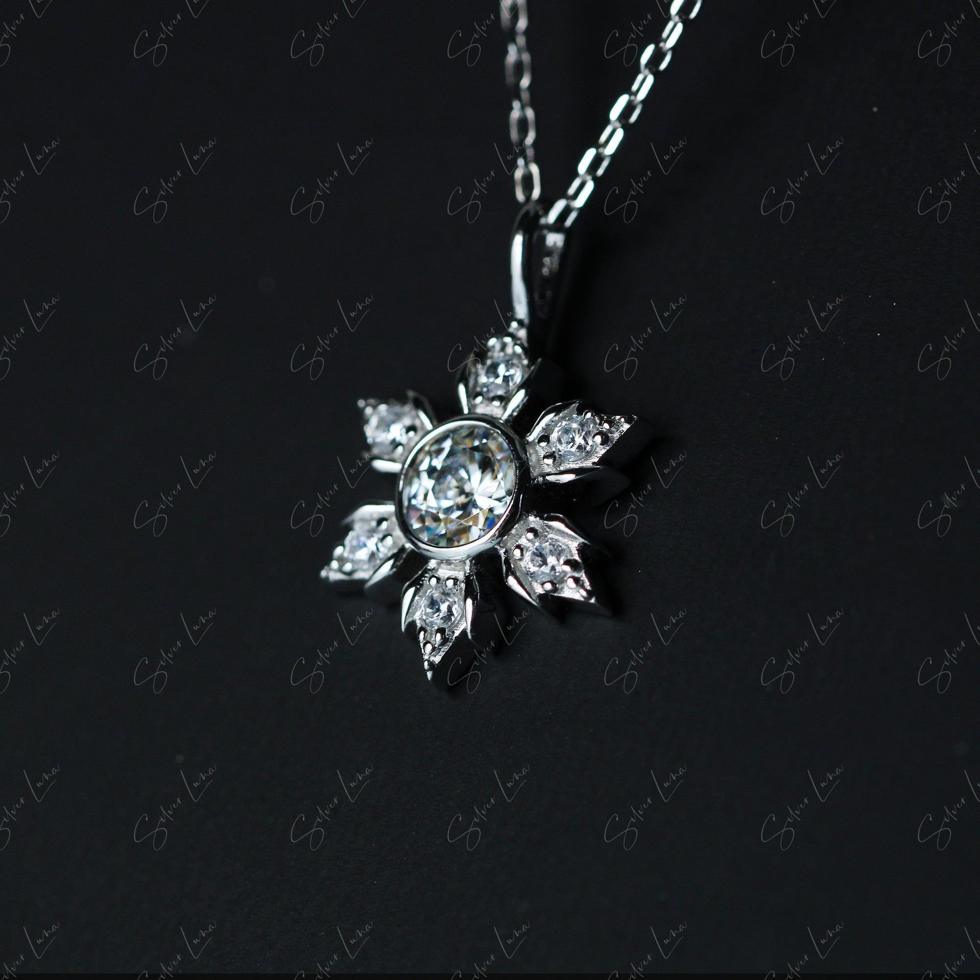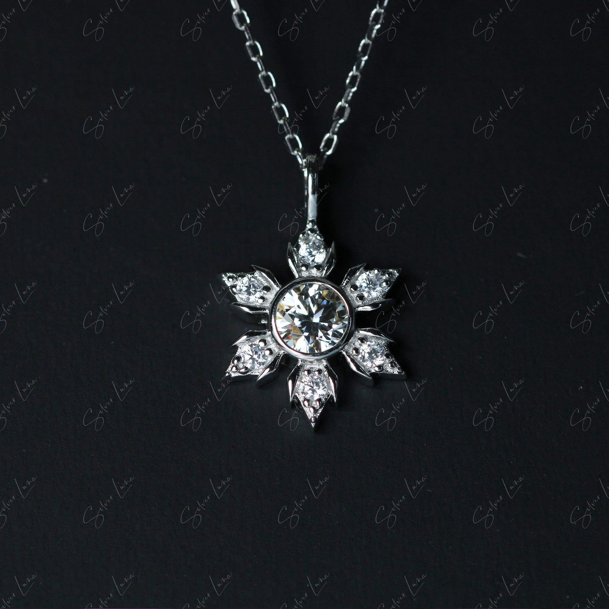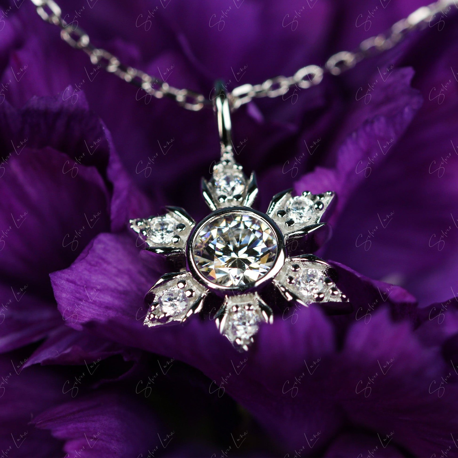 Embrace the holiday season with this stunning snowflake pendant necklace. Its focal point is a brilliant 0.5 CT Moissanite stone, framed by 6 sparkling cubic zirconia stones, all set against a solid 925 sterling silver base. The accompanying chain is also crafted from high-quality 925 sterling silver and coated with platinum for a luxurious shine. A must-have accessory to add sparkle and elegance to any outfit!