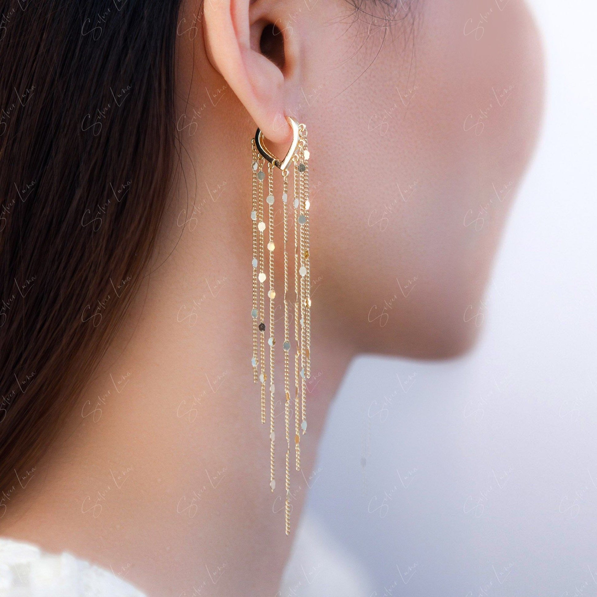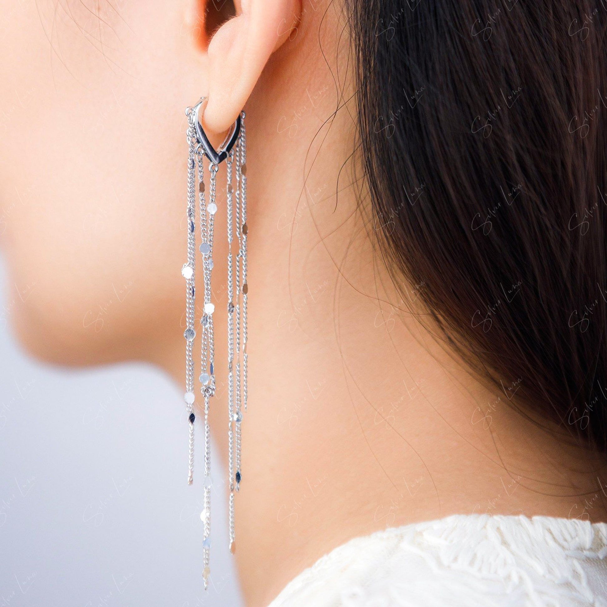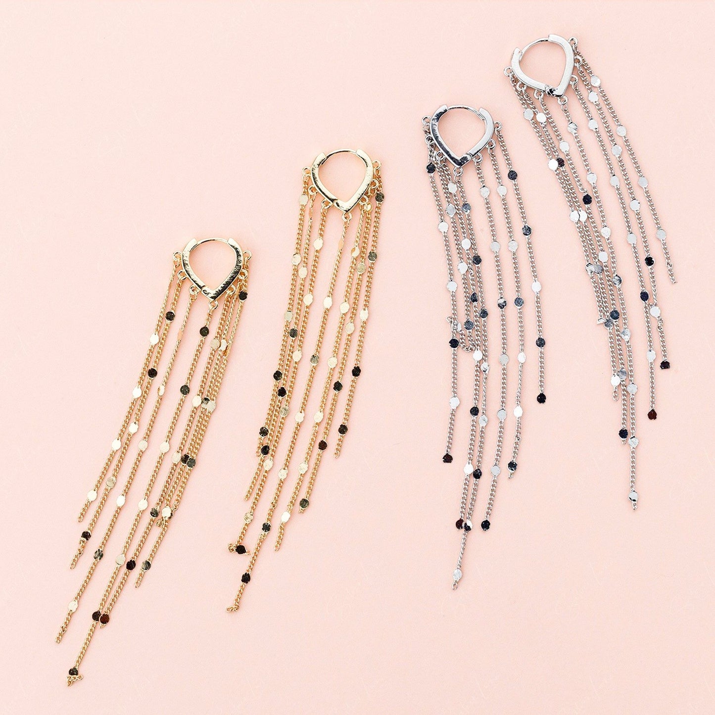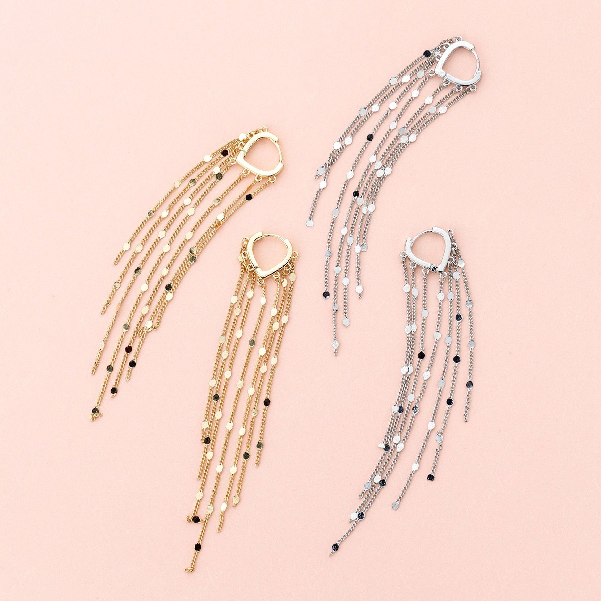 The metal chain tassel hoop earrings feature long tassel chains with sparkling texture to capture light refection and make you shine. These metal tassel chains hoop earrings are perfect for party outfit and everyday wear.