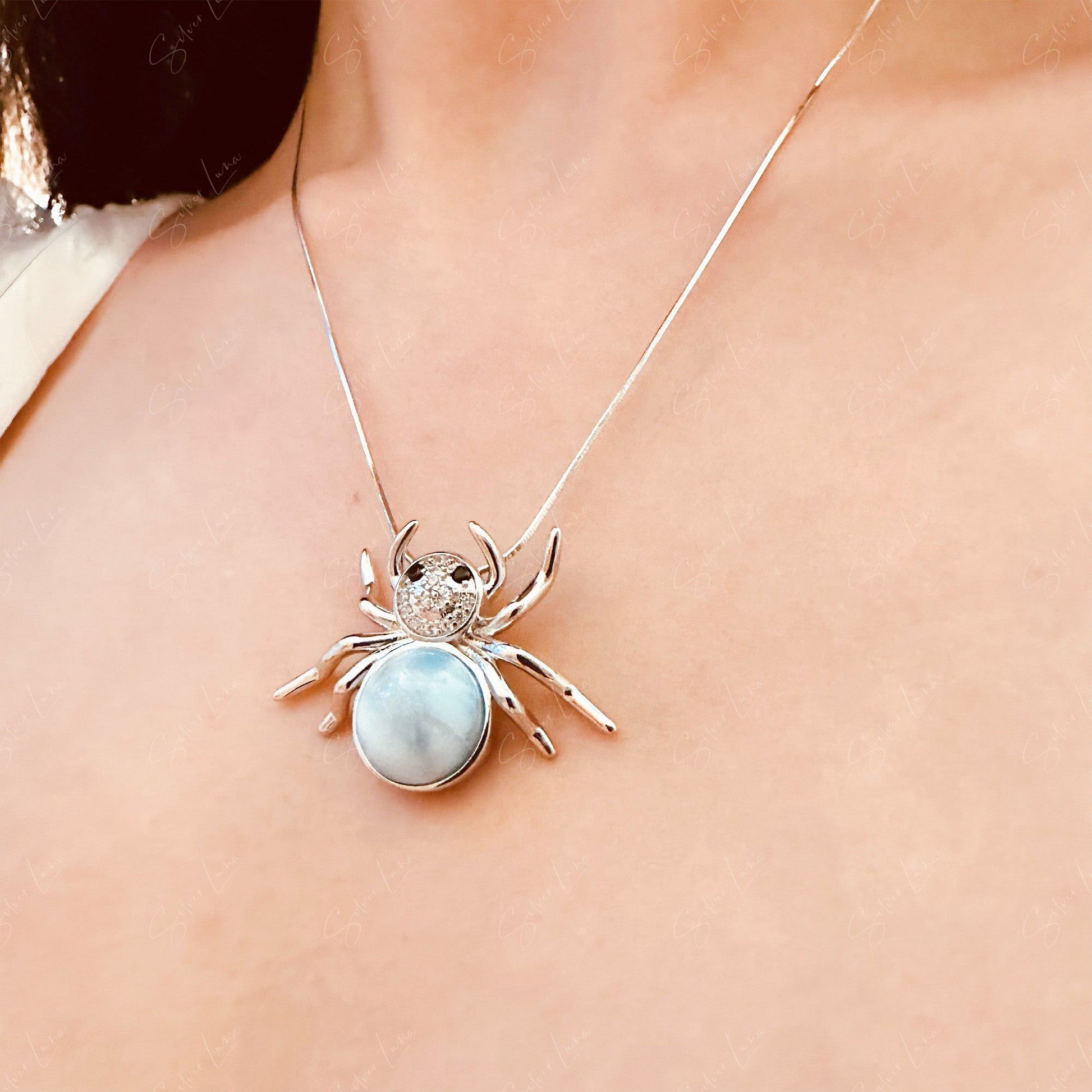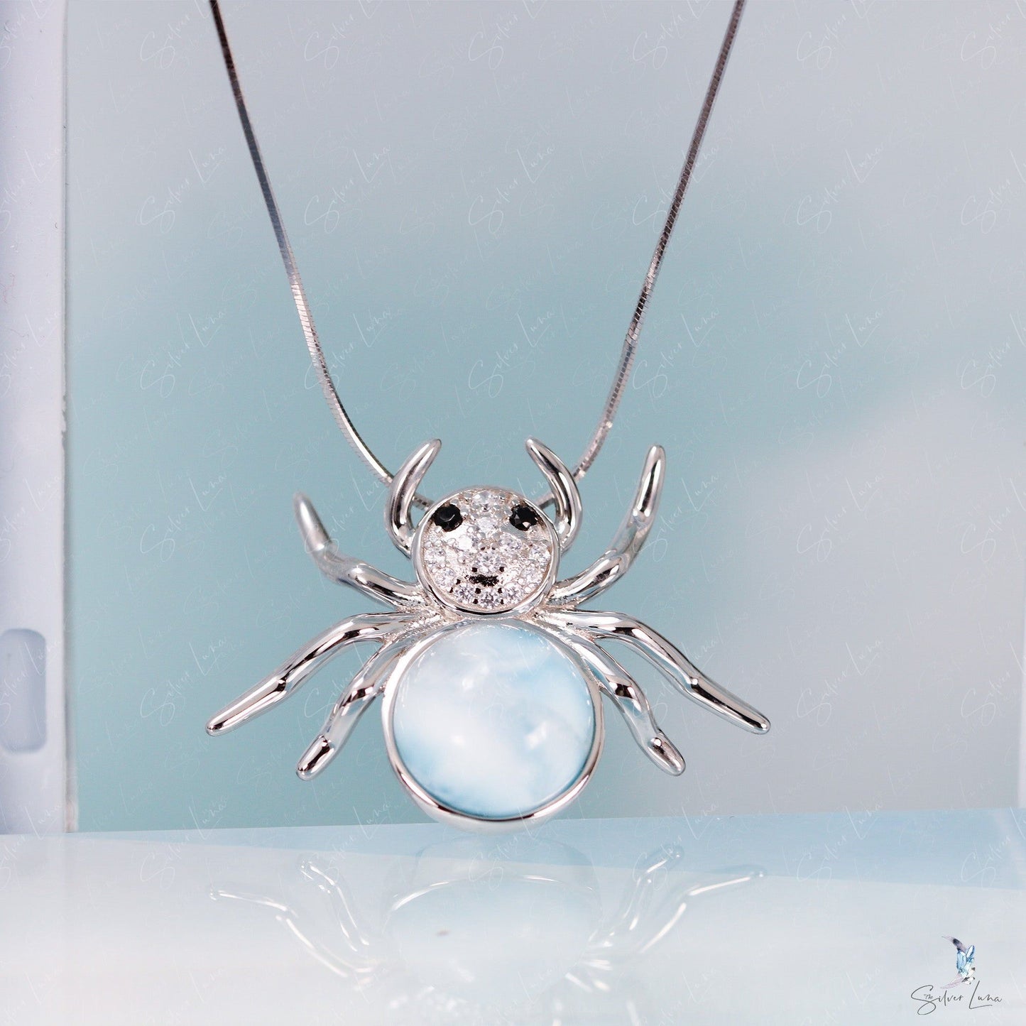This stunning spider Larimar pendant necklace showcases a remarkable 925 sterling silver spider charm adorned with a radiant blue Larimar stone on a sleek silver snake chain. Incorporate this distinctive piece into your daily fine jewelry selection or present it as a meaningful gift to a cherished individual.