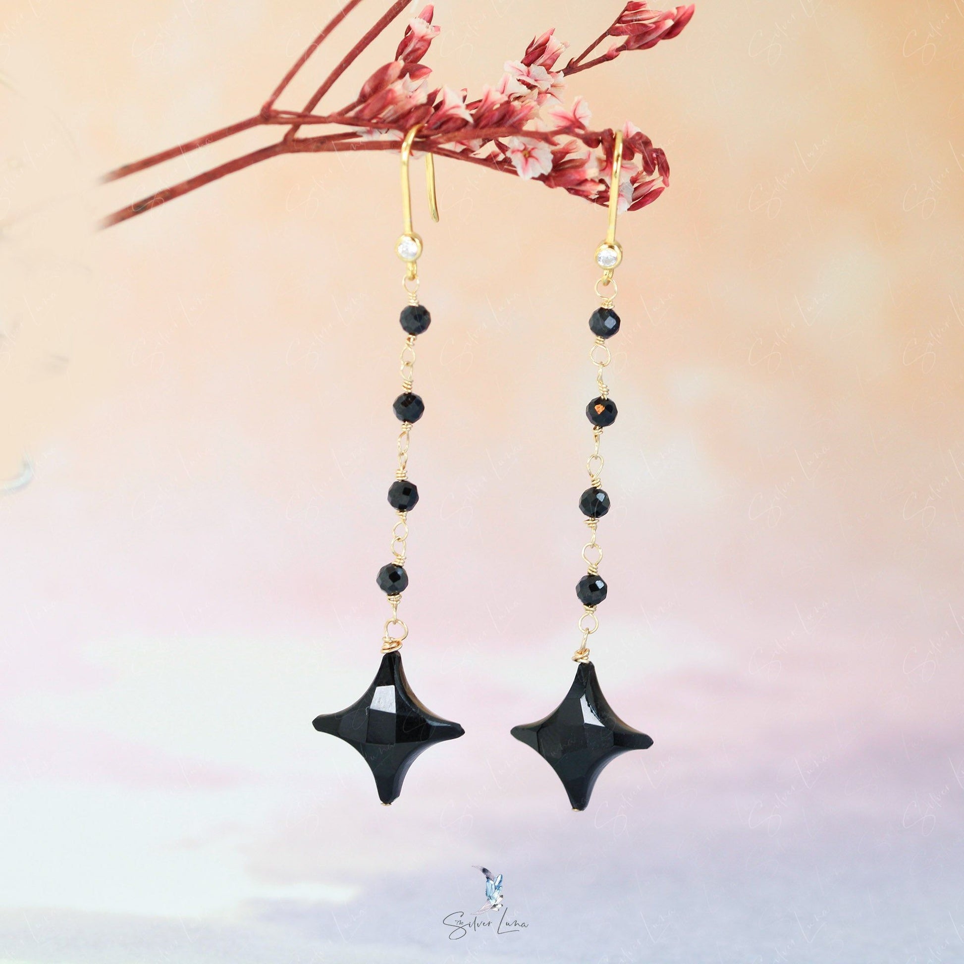 Upgrade your jewelry collection with these alluring black onyx and black spinel bead cascade earrings. A striking ninja star-shaped black onyx stone with a faceted cut dangles from a delicate chain embellished with small faceted black spinel beads. The earrings are completed with solid 925 sterling silver ear wires, accented with 18k gold plating and a dazzling cubic zirconia gemstone. These unique earrings are an excellent present for a special someone or a lavish addition to your own personal style.