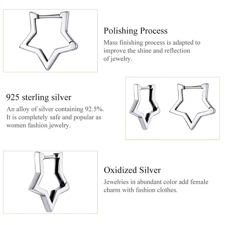 Add a celestial touch to your style with these stunning star shape hoop earrings in sterling silver. They are perfect for adding a touch of elegance and charm to any outfit. These earrings are a must-have for any fashionista!