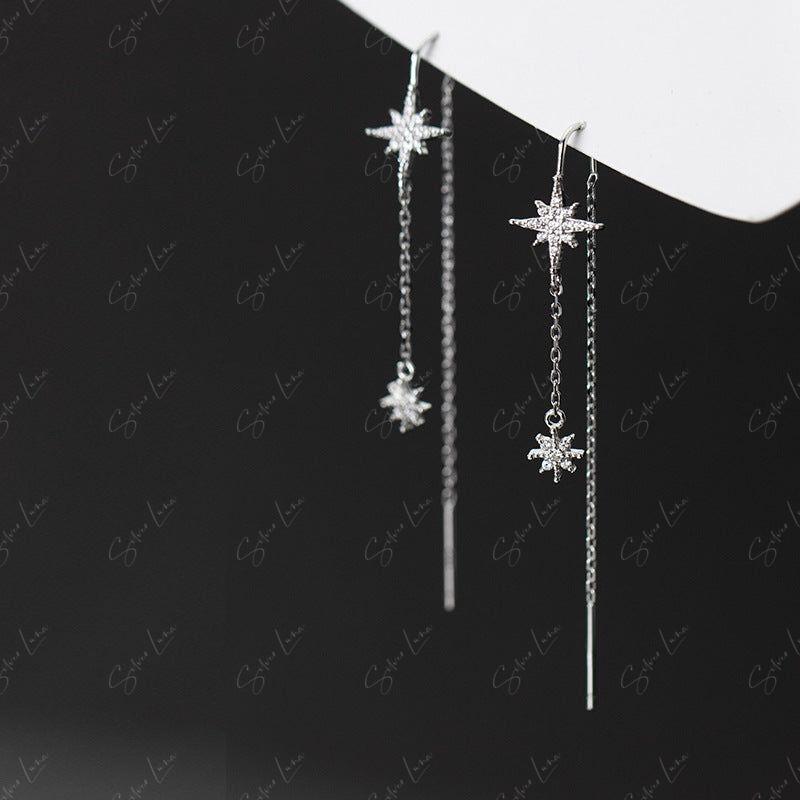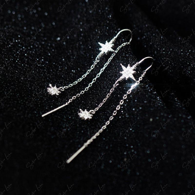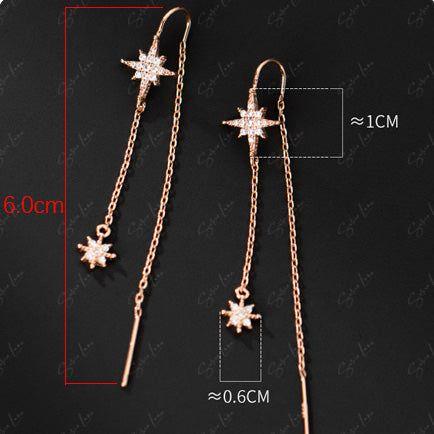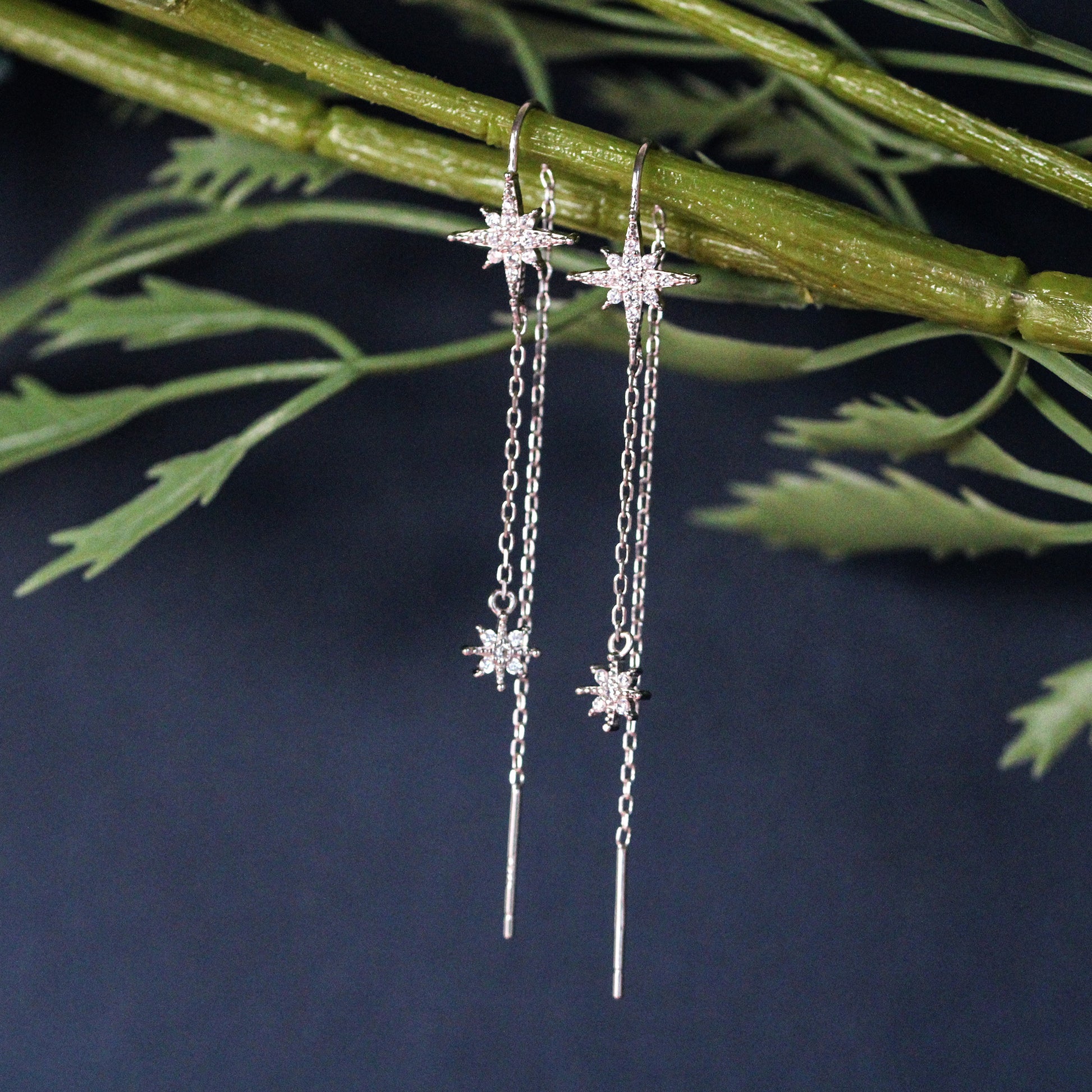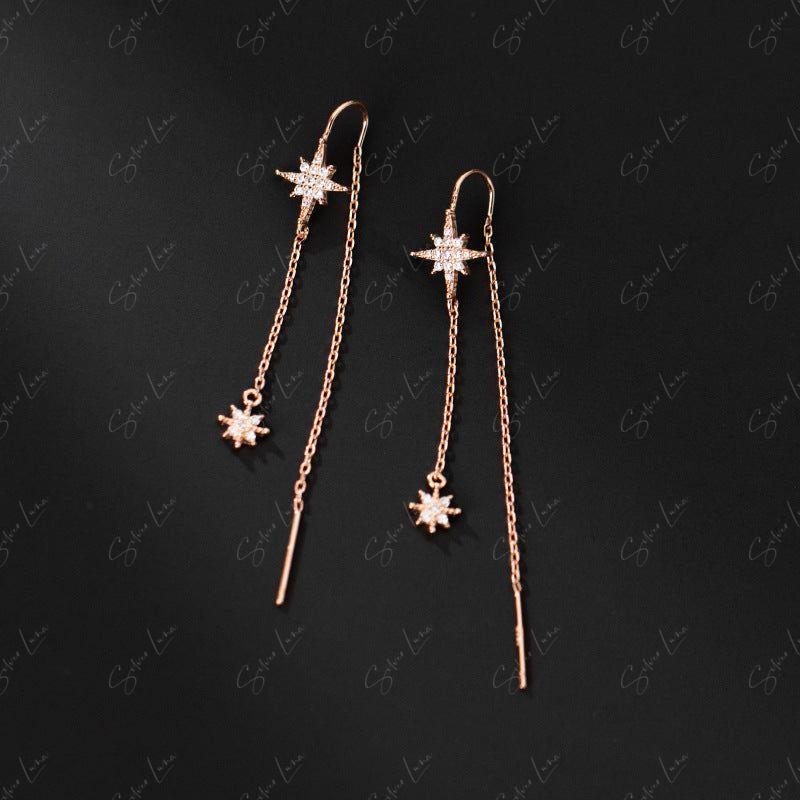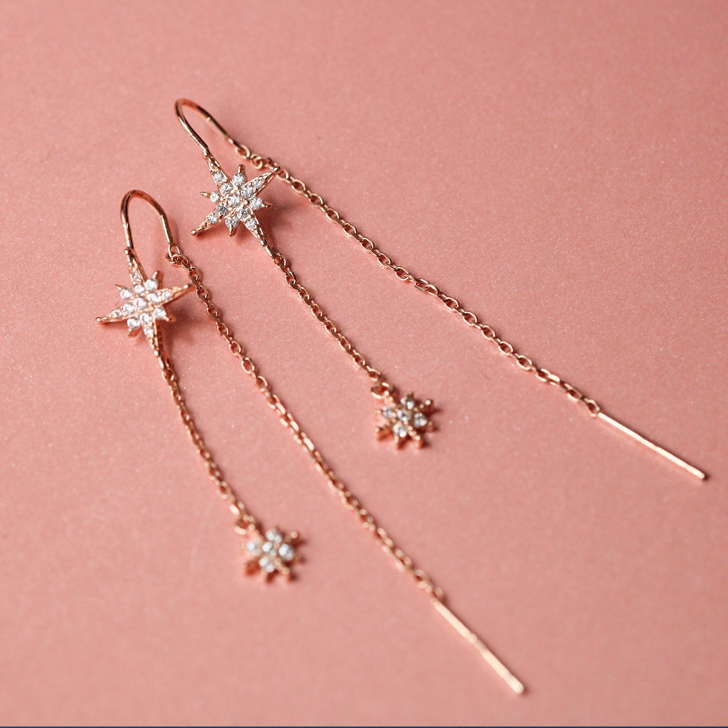 These elegant star dangle drop earrings ear threader features cable chain threaders with cubic zirconia stars dangle drop, made of solid 925 sterling silver with platinum or rose gold plating. Add these elegant star dangle threader to your everyday fine jewelry collection or as gift for your love one. Experience the luxury and sparkle of these threader earrings every day. Made from high-quality materials and featuring dazzling cubic zirconia stars, these earrings are sure to elevate your style and make a thoughtful gift for someone special. Treat yourself to the best in fine jewelry with the Starburst threader dangle drop earrings.