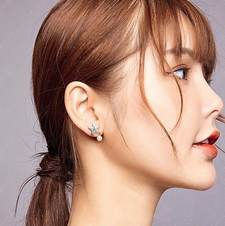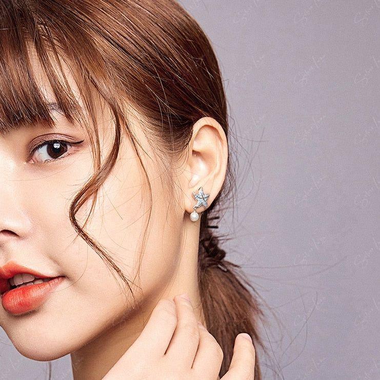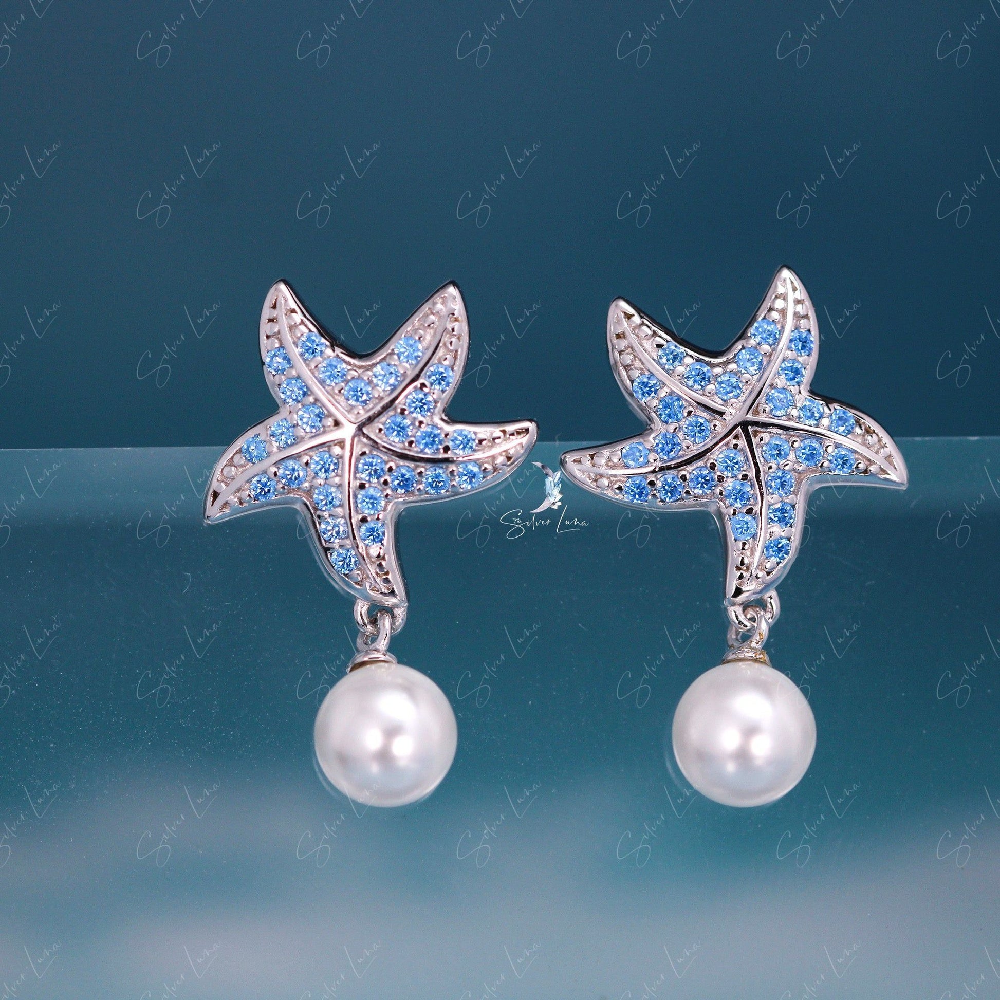 Add these stunning Starfish pearl drop earrings to your collection of fine jewelry. Made with solid 925 sterling silver and platinum platting, these elegant earrings feature a blue starfish with a pearl dangling charm adorned with cubic zirconia pave. Perfect for everyday wear or as a heartfelt gift for a loved one, these earrings are a must-have for any jewelry lover.