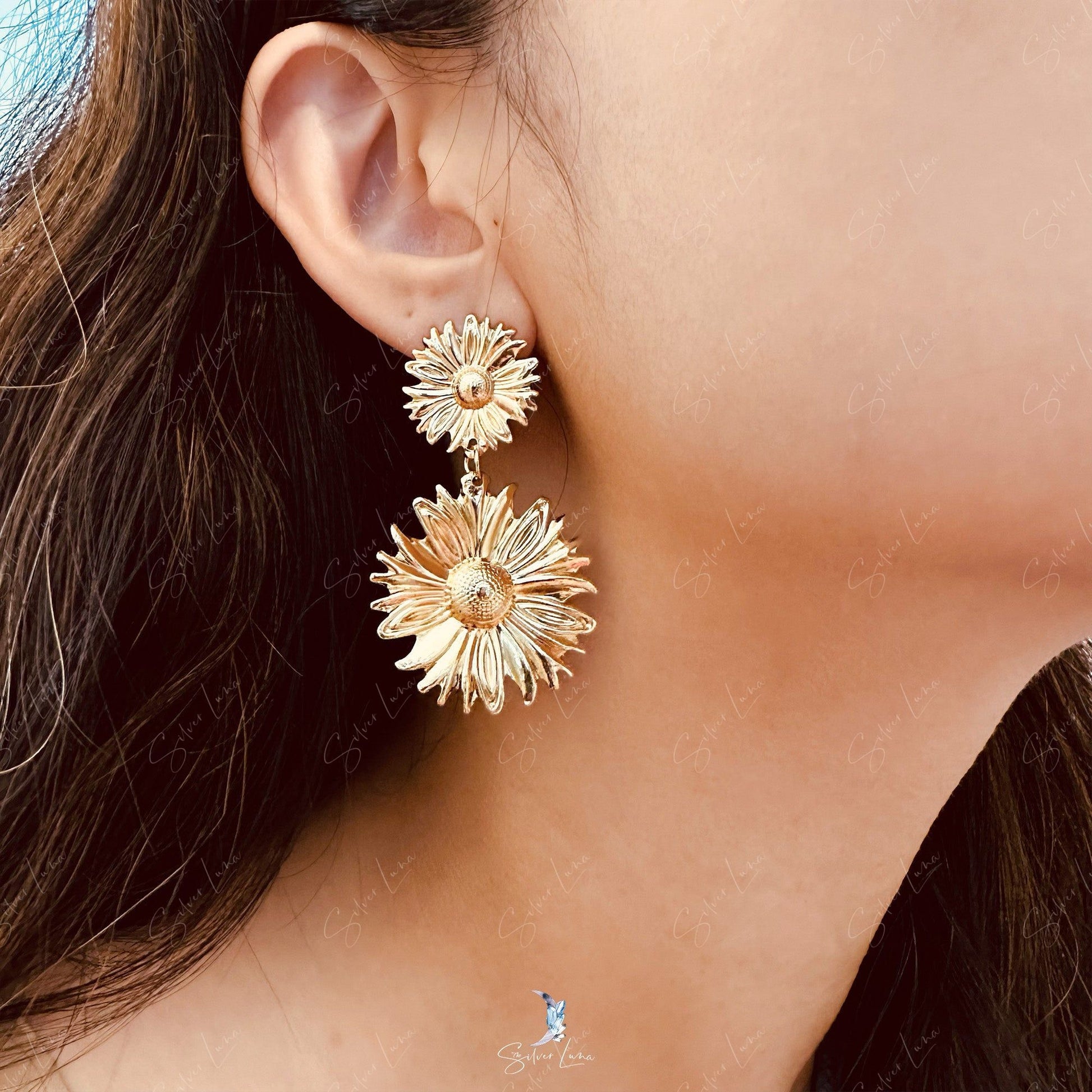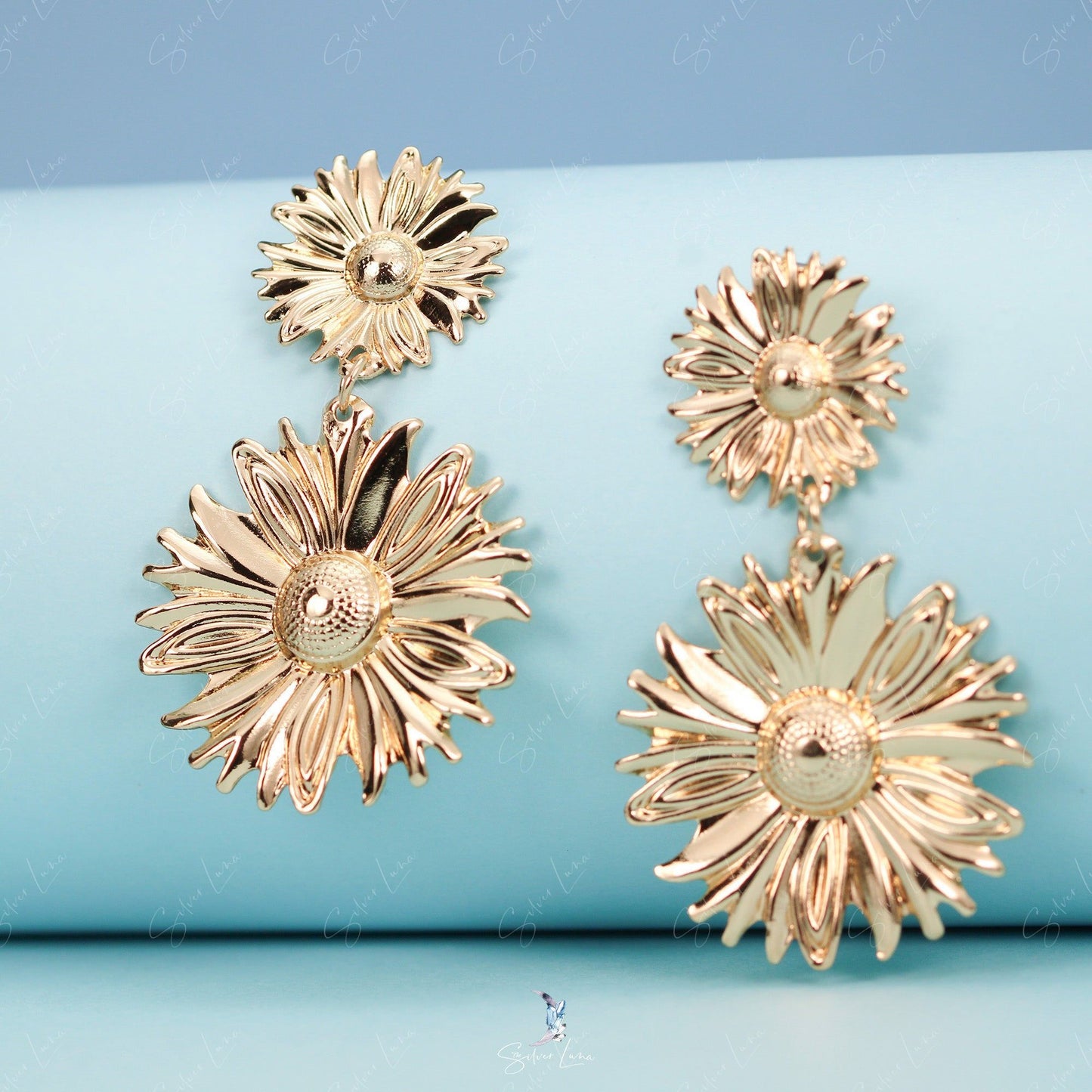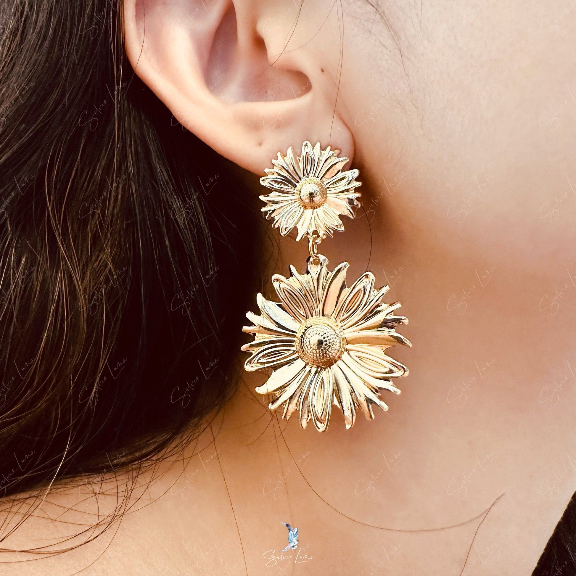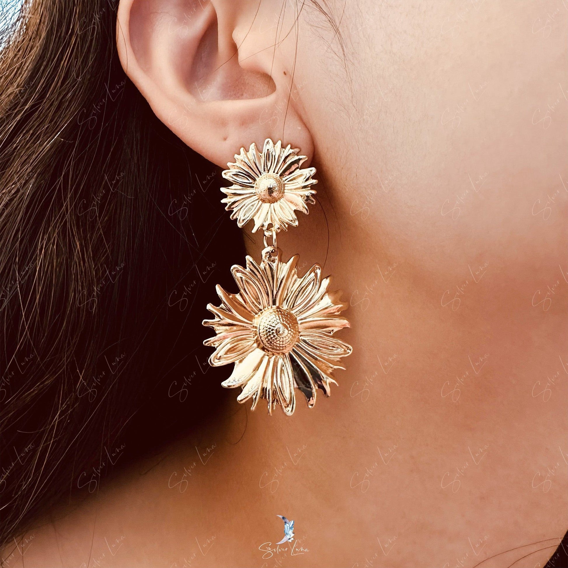 These sun flower big statement fashion earrings features beautiful double golden sun flower, light weight and comfortable to wear everyday. Add these beautiful sun flower stud earrings to your everyday fashion jewelry collection or as gift for your love one.