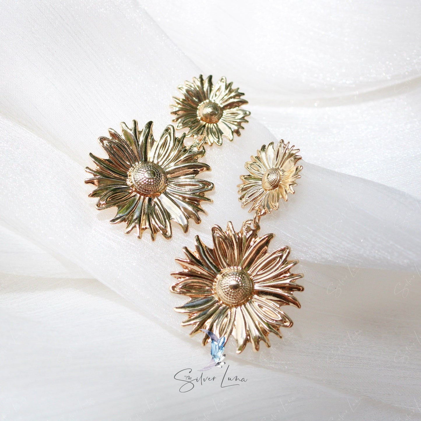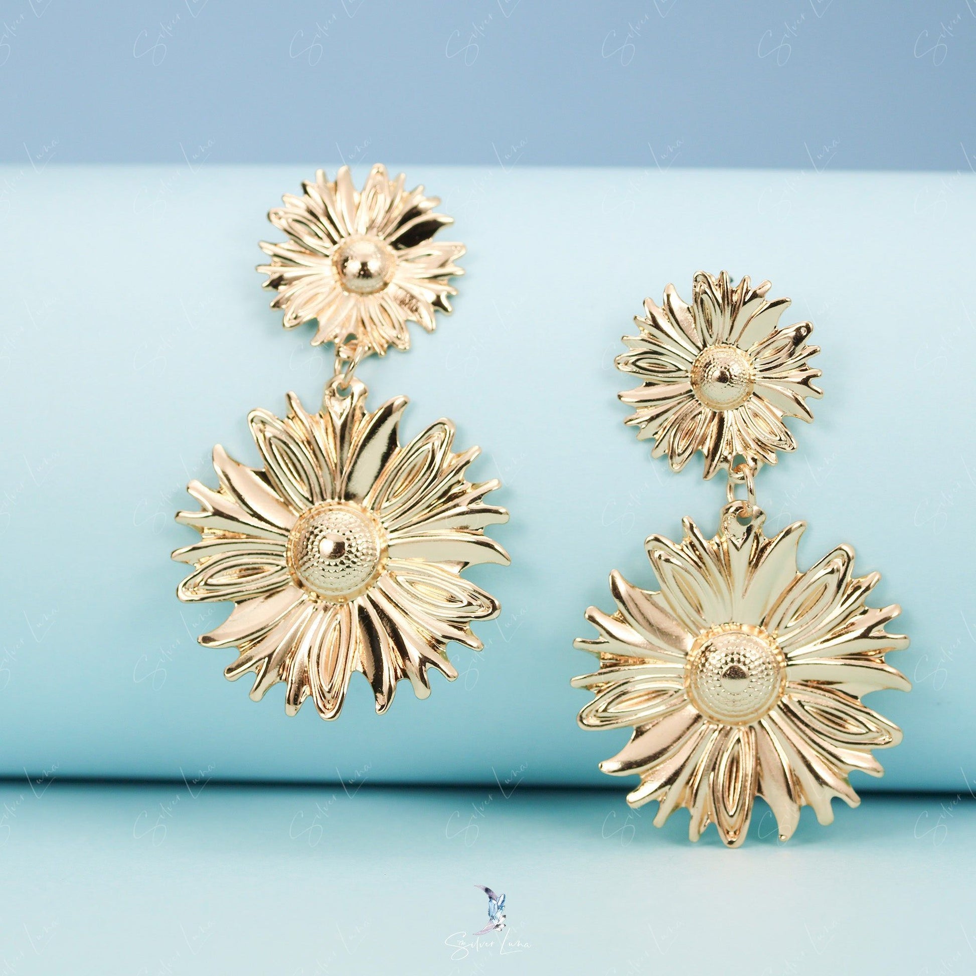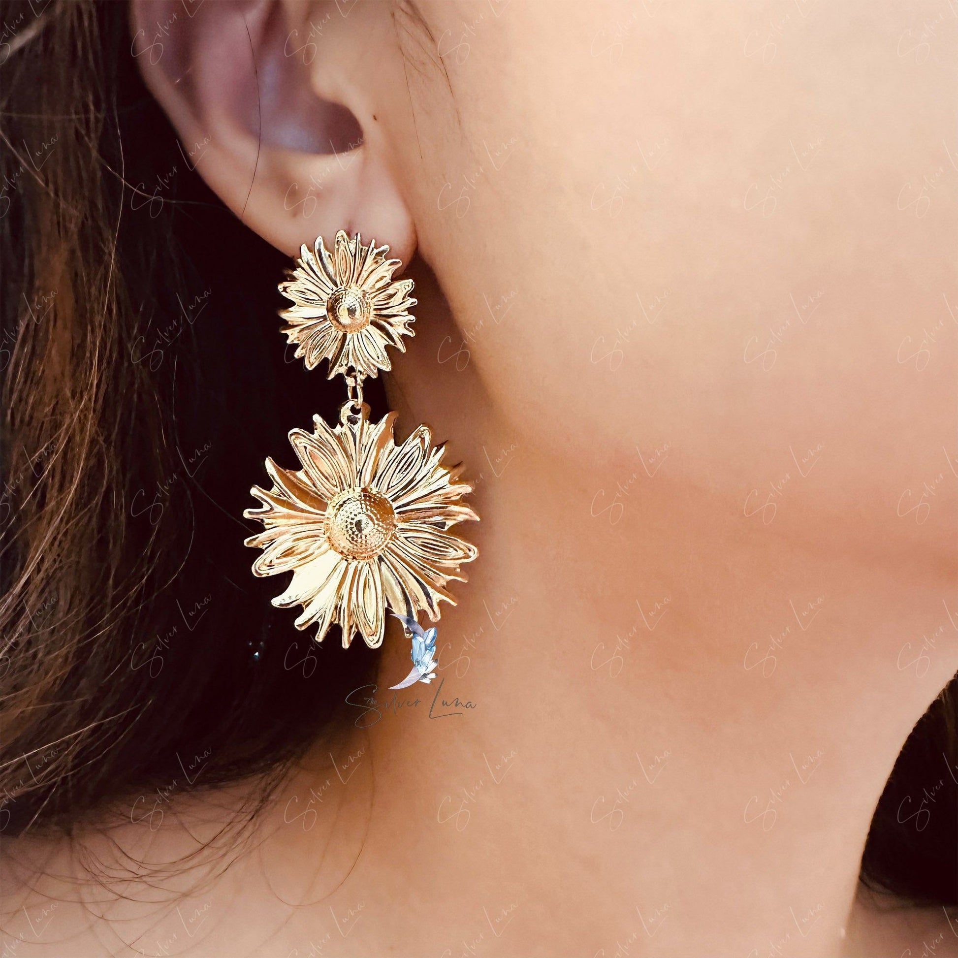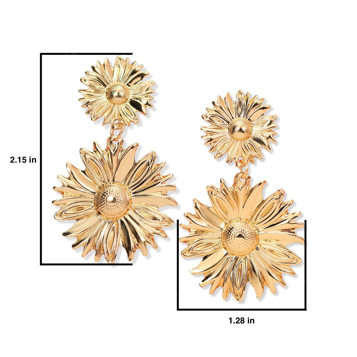 These sun flower big statement fashion earrings features beautiful double golden sun flower, light weight and comfortable to wear everyday. Add these beautiful sun flower stud earrings to your everyday fashion jewelry collection or as gift for your love one.