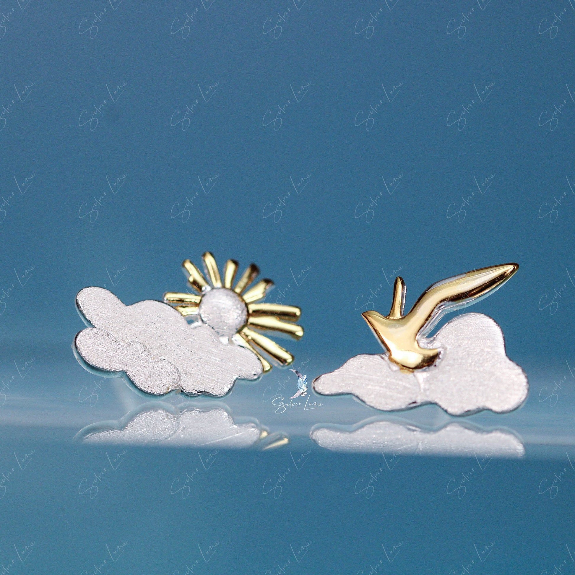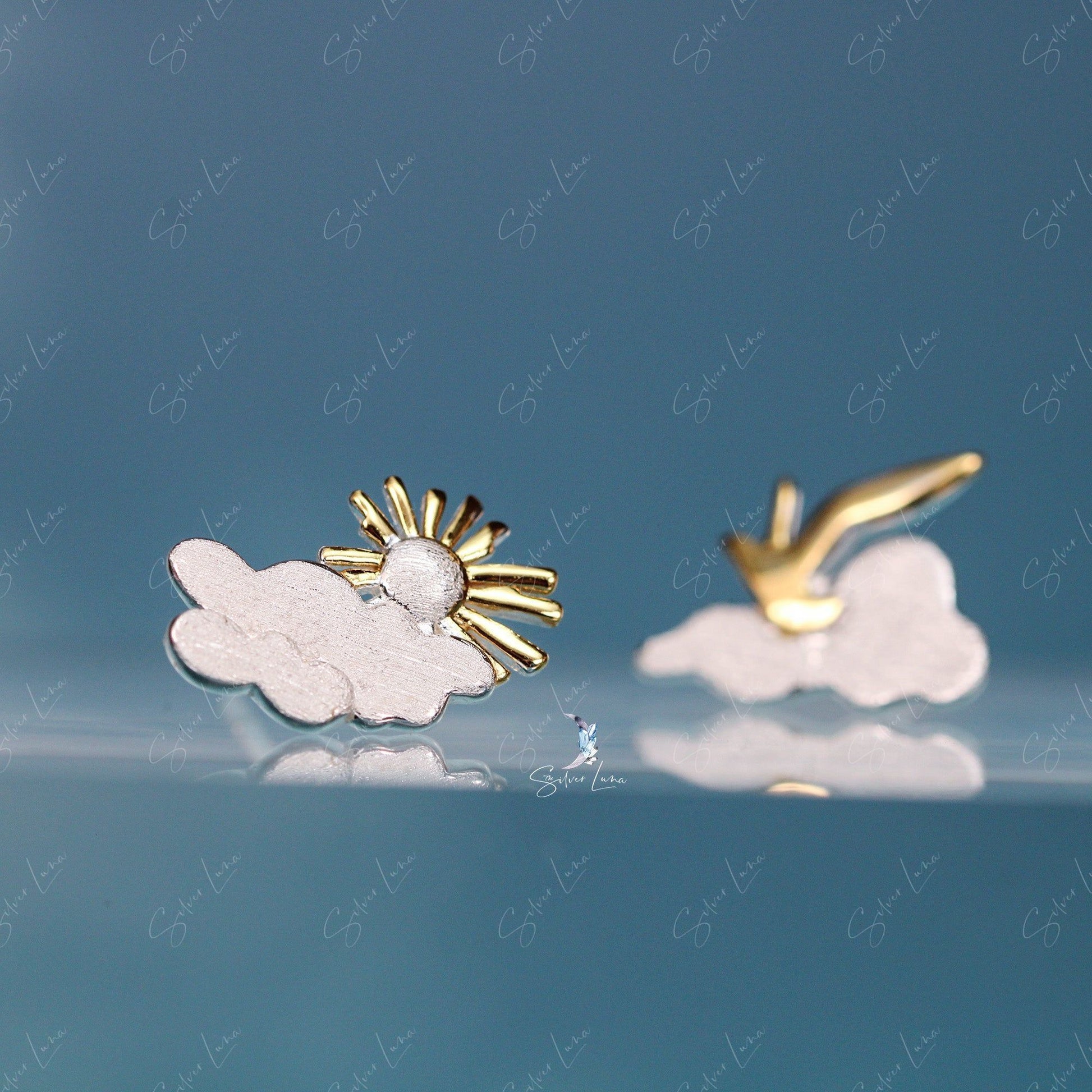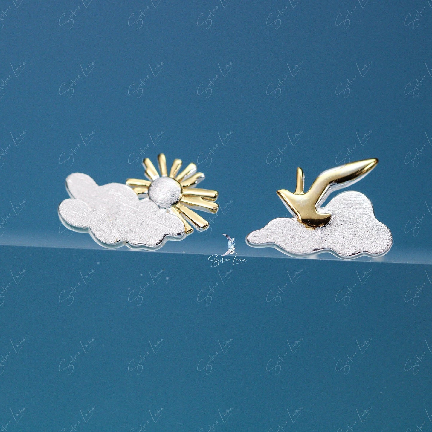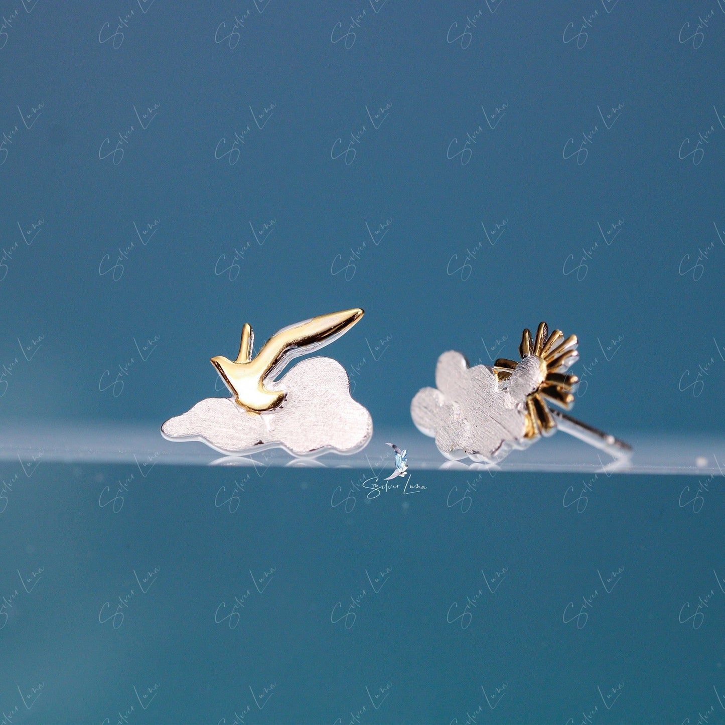 Swallow bird, sun, and cloud sterling silver stud earrings