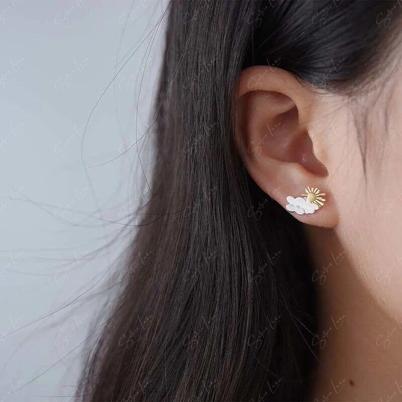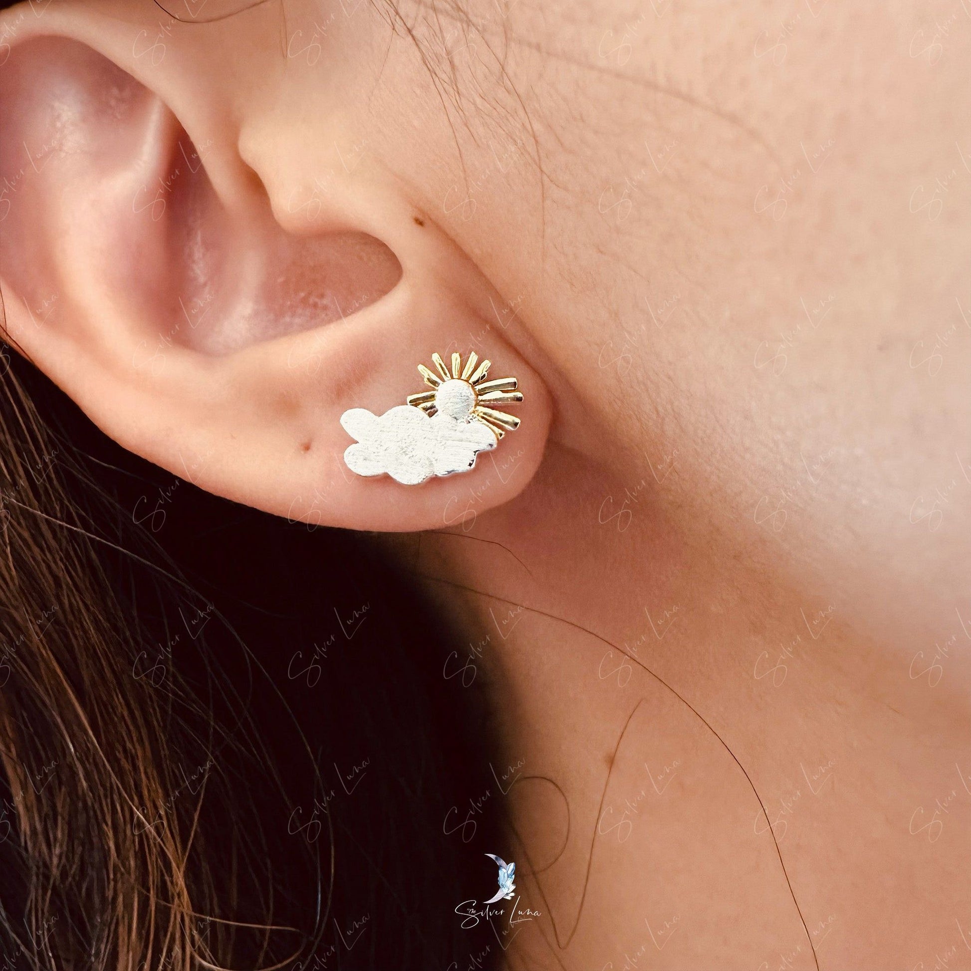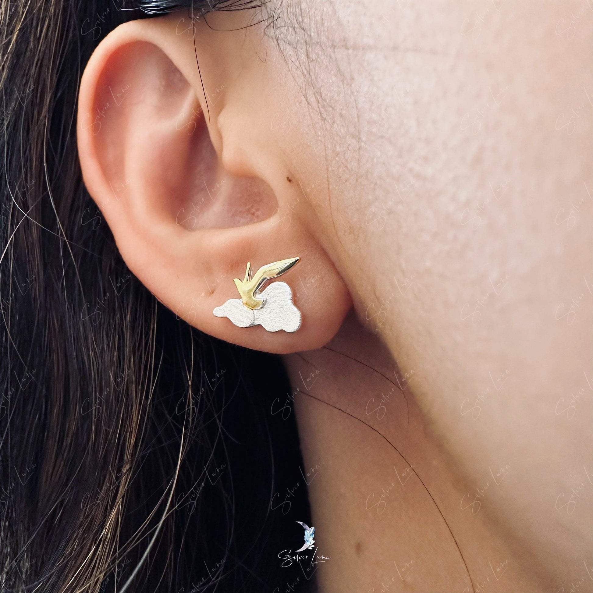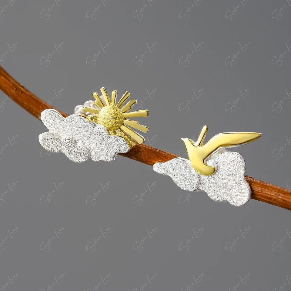 Swallow bird, sun, and cloud sterling silver stud earrings