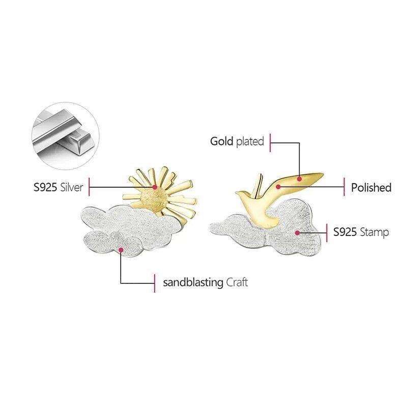 These sterling silver stud earrings take flight with whimsical cloud, bird and sun motifs. The asymmetric design features a cloud stud with a golden sun and a cloud stud with a golden bird, giving your ears a sense of wonder and wanderlust. Handcrafted from solid 925 sterling silver with a brushed finish on the clouds and gold plating on the bird and sun for contrast and detail, these unique earrings will infuse your everyday wardrobe with a touch of imaginative style. Perfect for the free spirit, they make a statement while remaining understated - letting the motifs do the talking. Slip them on and watch as the world becomes a little brighter, full of possibility and adventure, just like the clouds, sun and birds that inspired their creation.