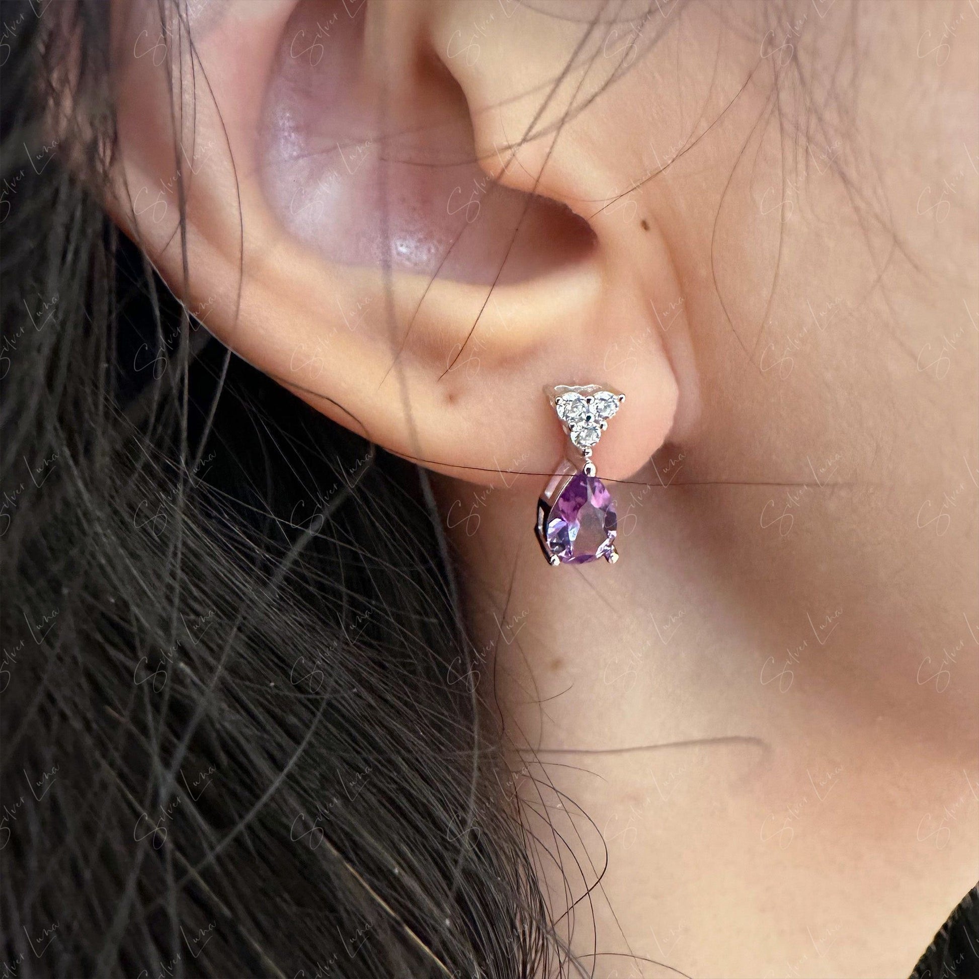 These darling teardrop Alexandrite stud earrings are sure to become your new favorite go-to pair. Made from sterling silver with change color Alexandrite gemstones and cubic zirconia accents, they add a subtle yet stunning pop to any outfit. The teardrop cut Alexandrite stones capture light and transform from emerald green to purplish red depending on the setting, offering double the style for one reasonable price. Slip them on for an instant upgrade, whether you're heading to work or out for a casual night on the town. Their elegant yet understated silhouette will complement nearly any jewelry collection, making them a versatile gift for the fashion-forward woman in your life. Add a touch of magic to your look with these chameleon gemstone earrings from The Silver Luna.