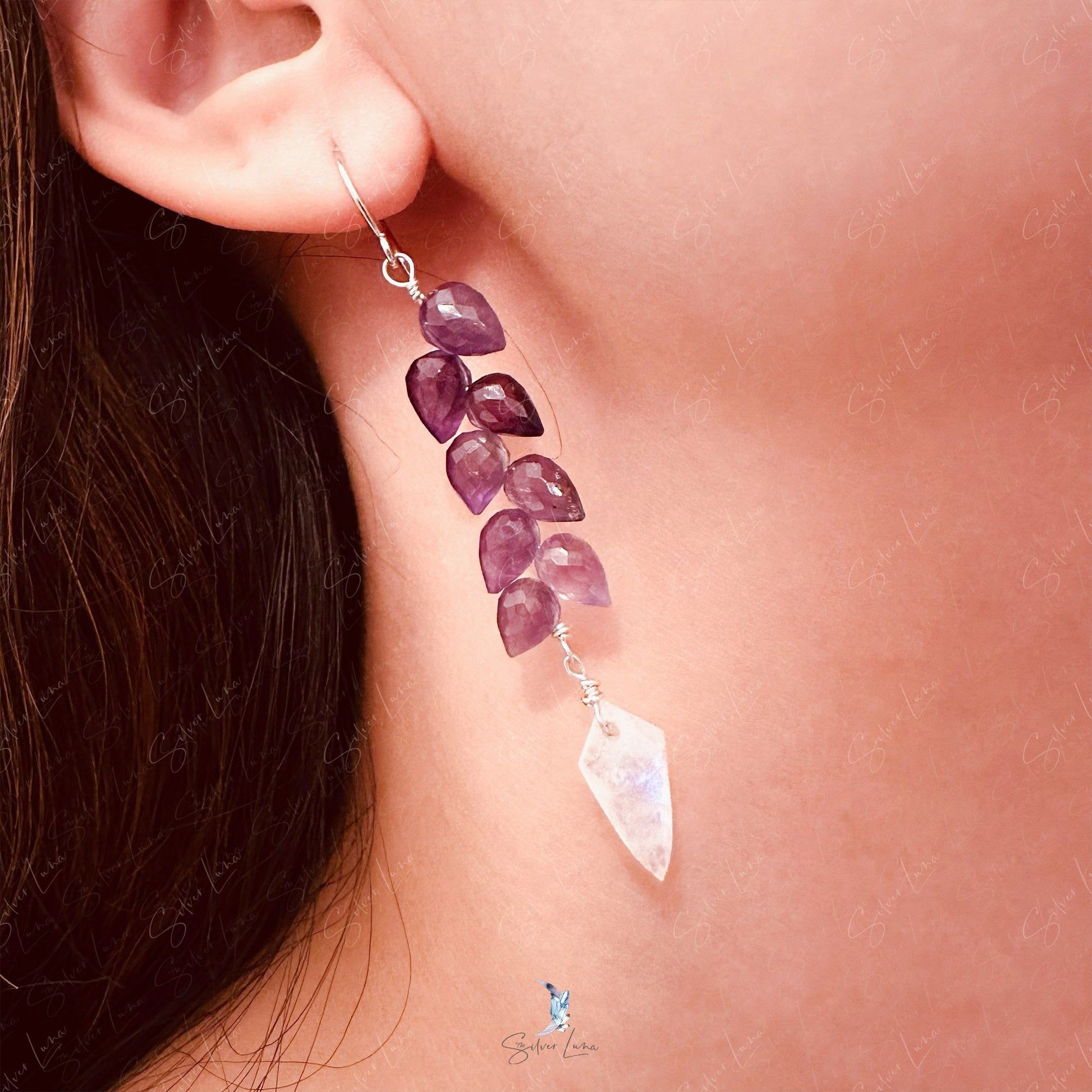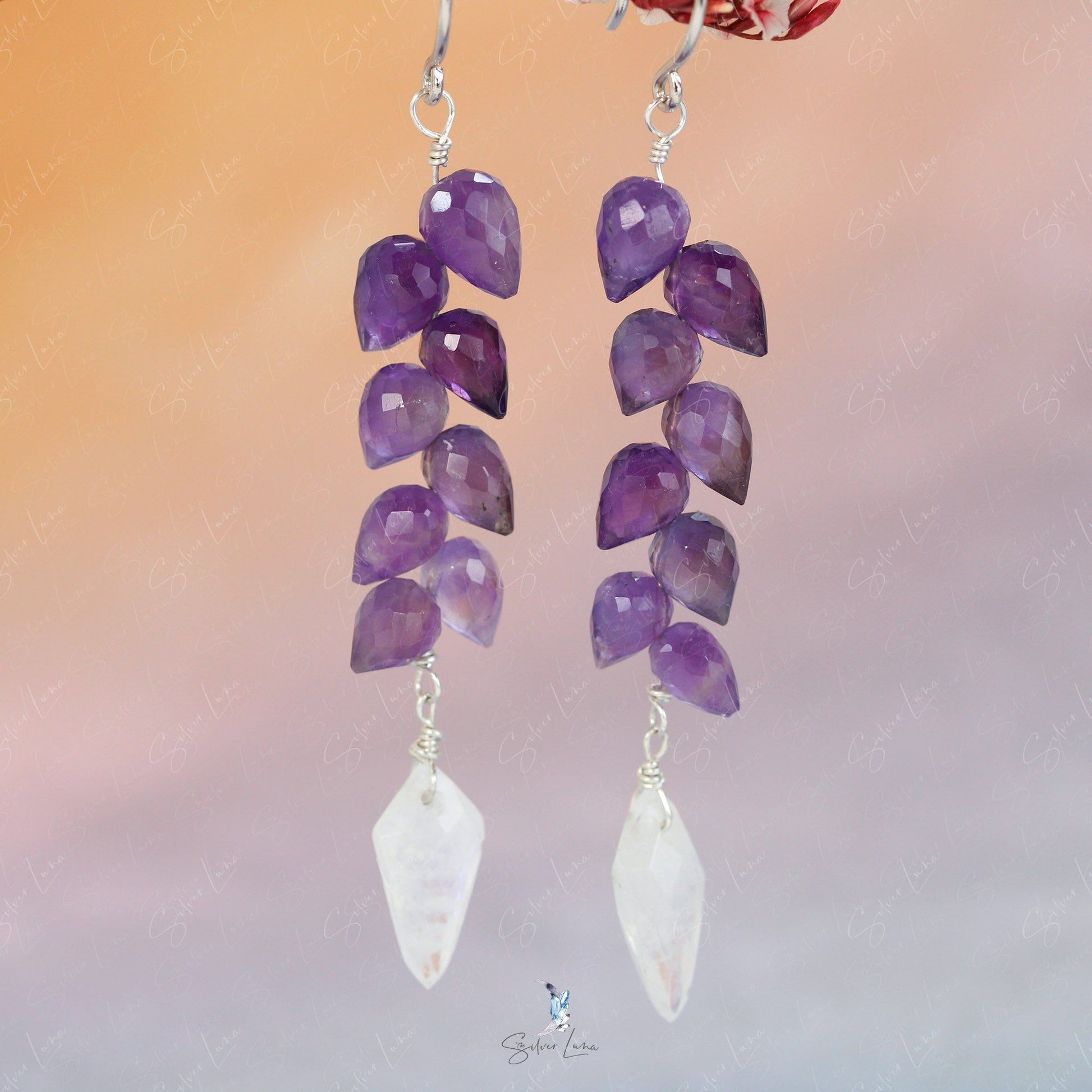 Teardrop Amethyst and arrow rainbow moonstone handmade earrings