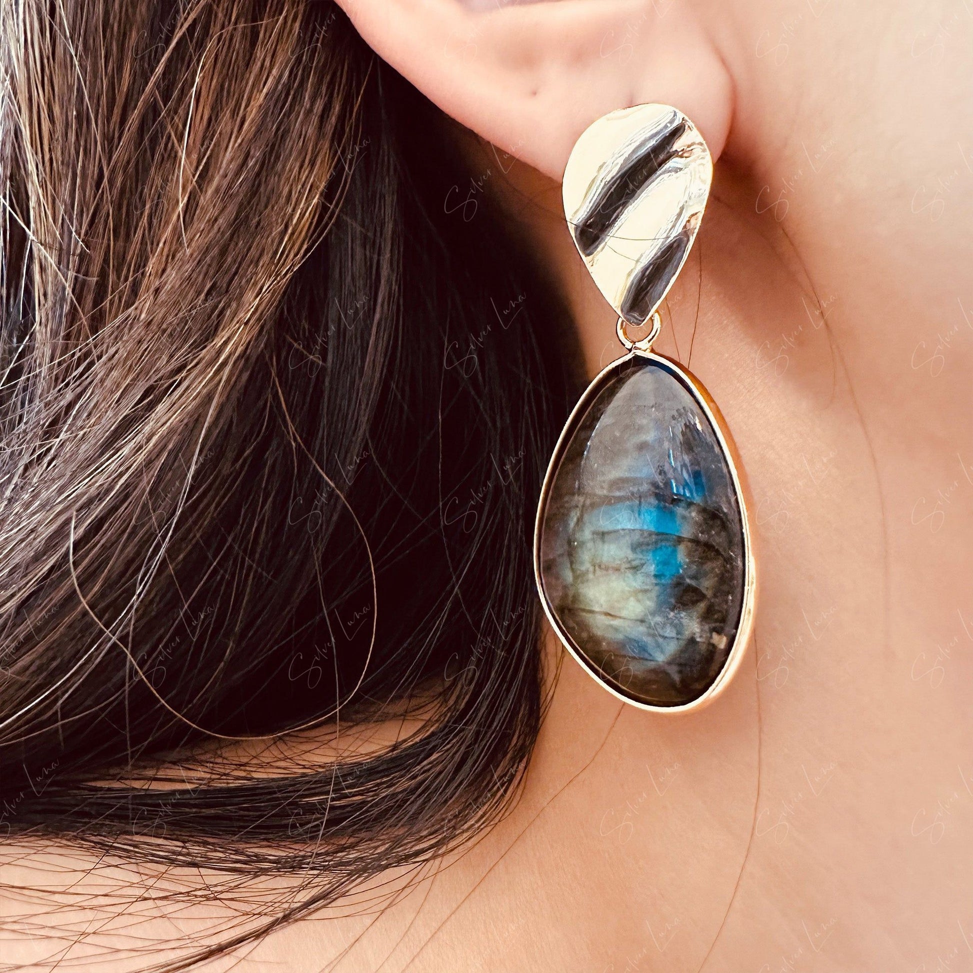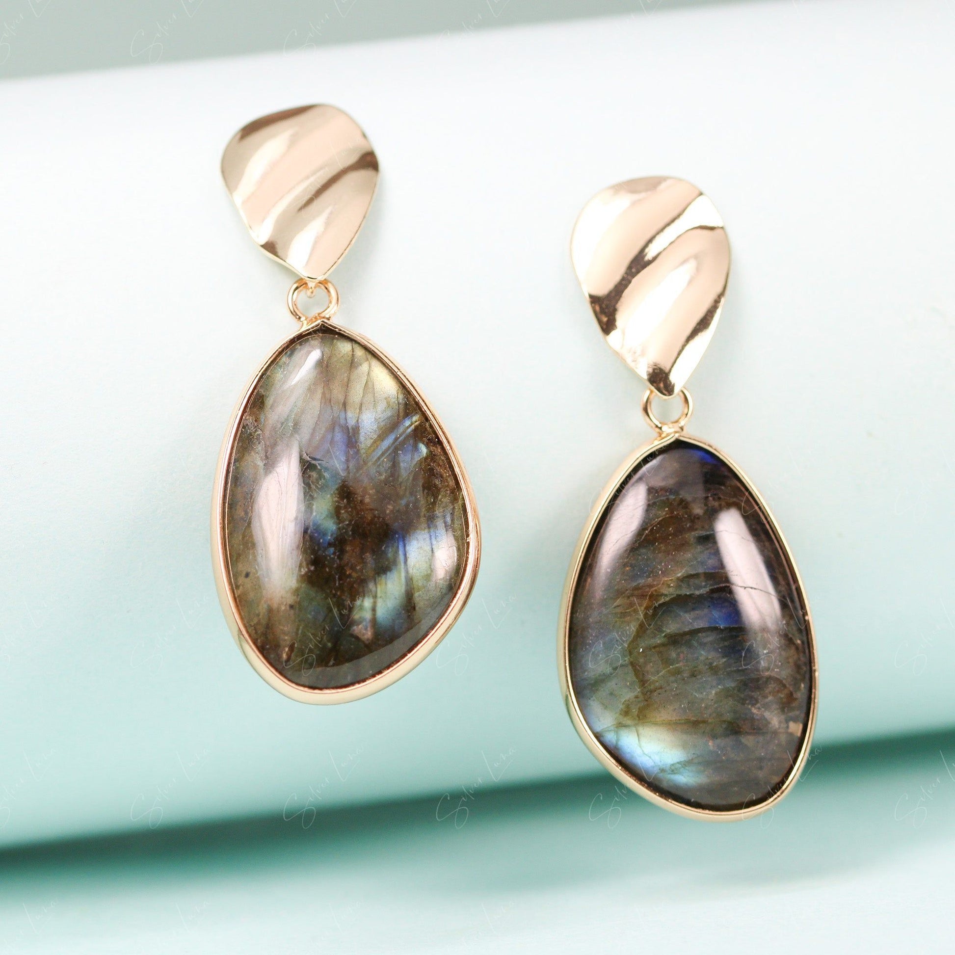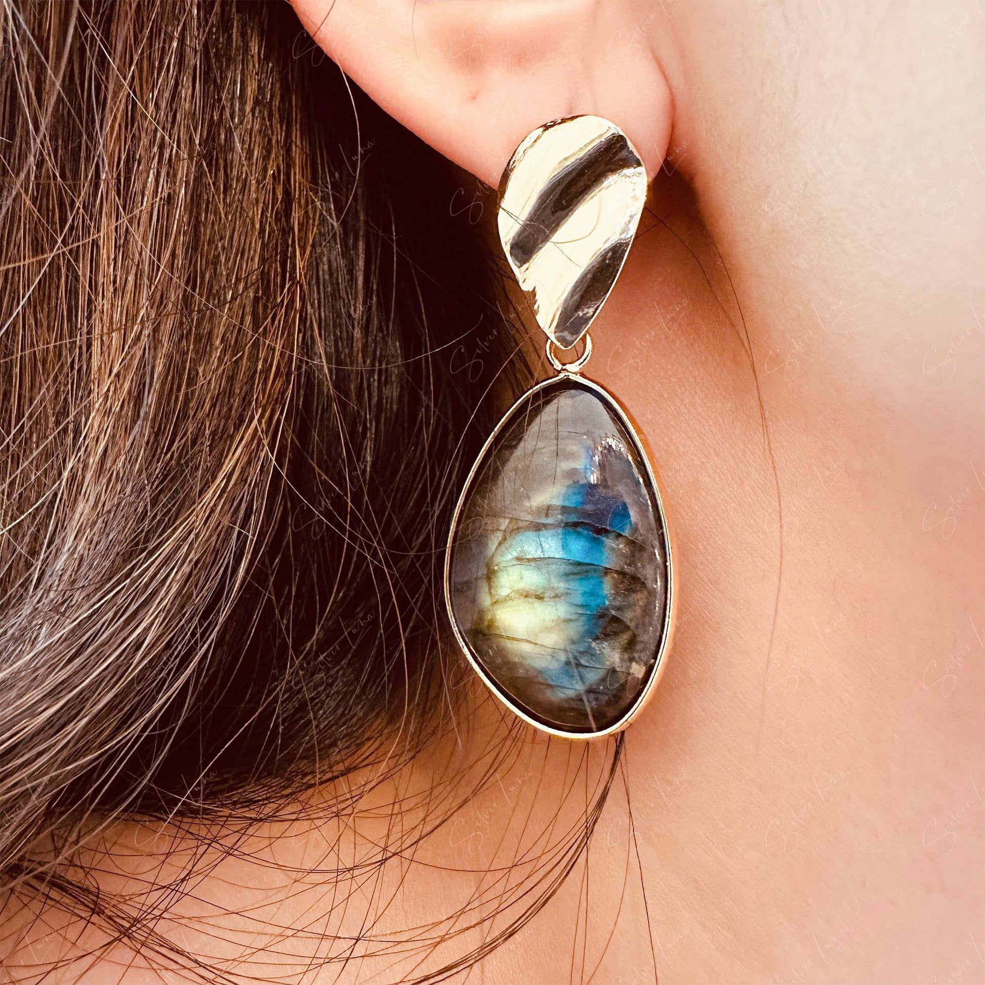 Indulge in the awe-inspiring beauty of natural labradorite with these stunning teardrop dangle earrings. The elegant gold plated brass ear studs add a touch of sophistication, elevating your everyday look. Make a statement and let your inherent beauty shine with these distinctive earrings.