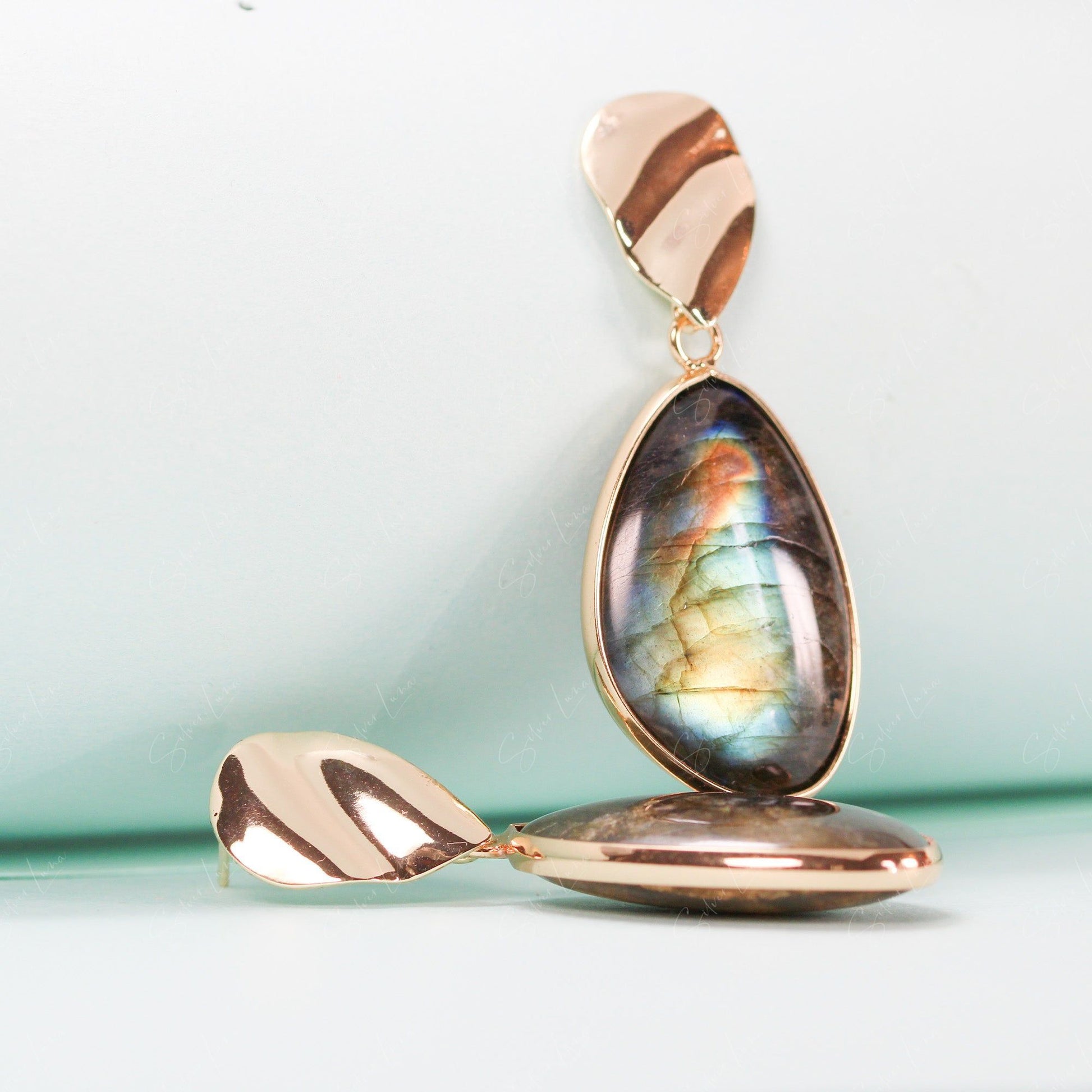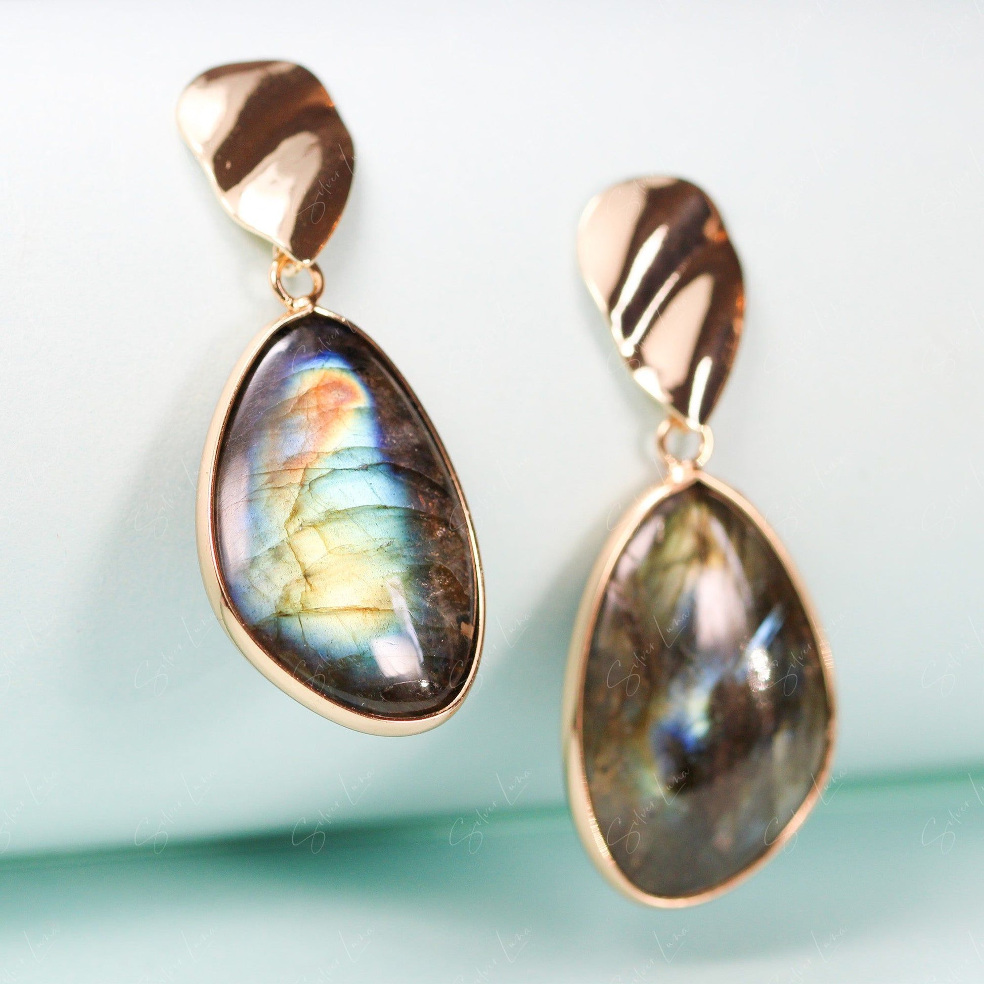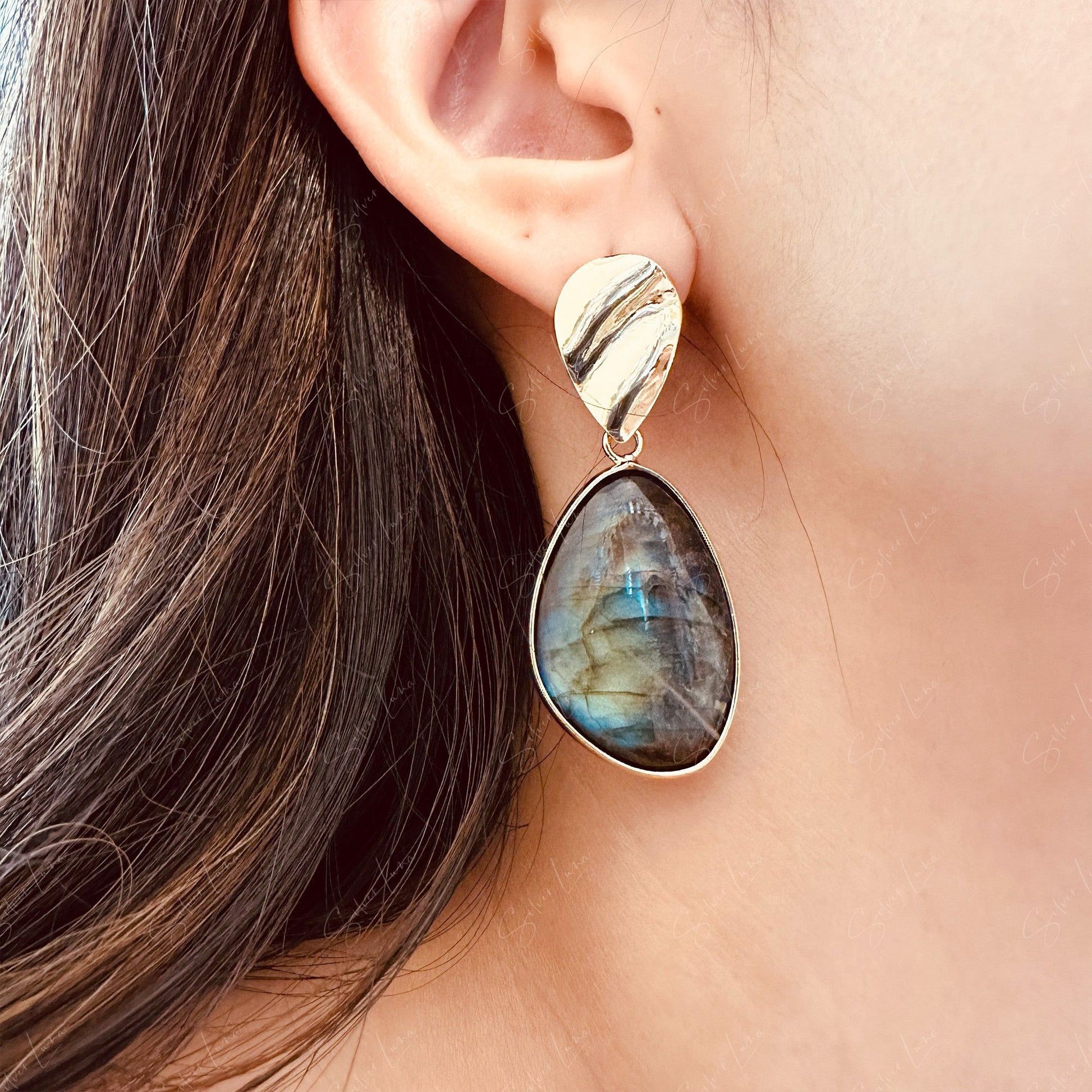 Indulge in the awe-inspiring beauty of natural labradorite with these stunning teardrop dangle earrings. The elegant gold plated brass ear studs add a touch of sophistication, elevating your everyday look. Make a statement and let your inherent beauty shine with these distinctive earrings.