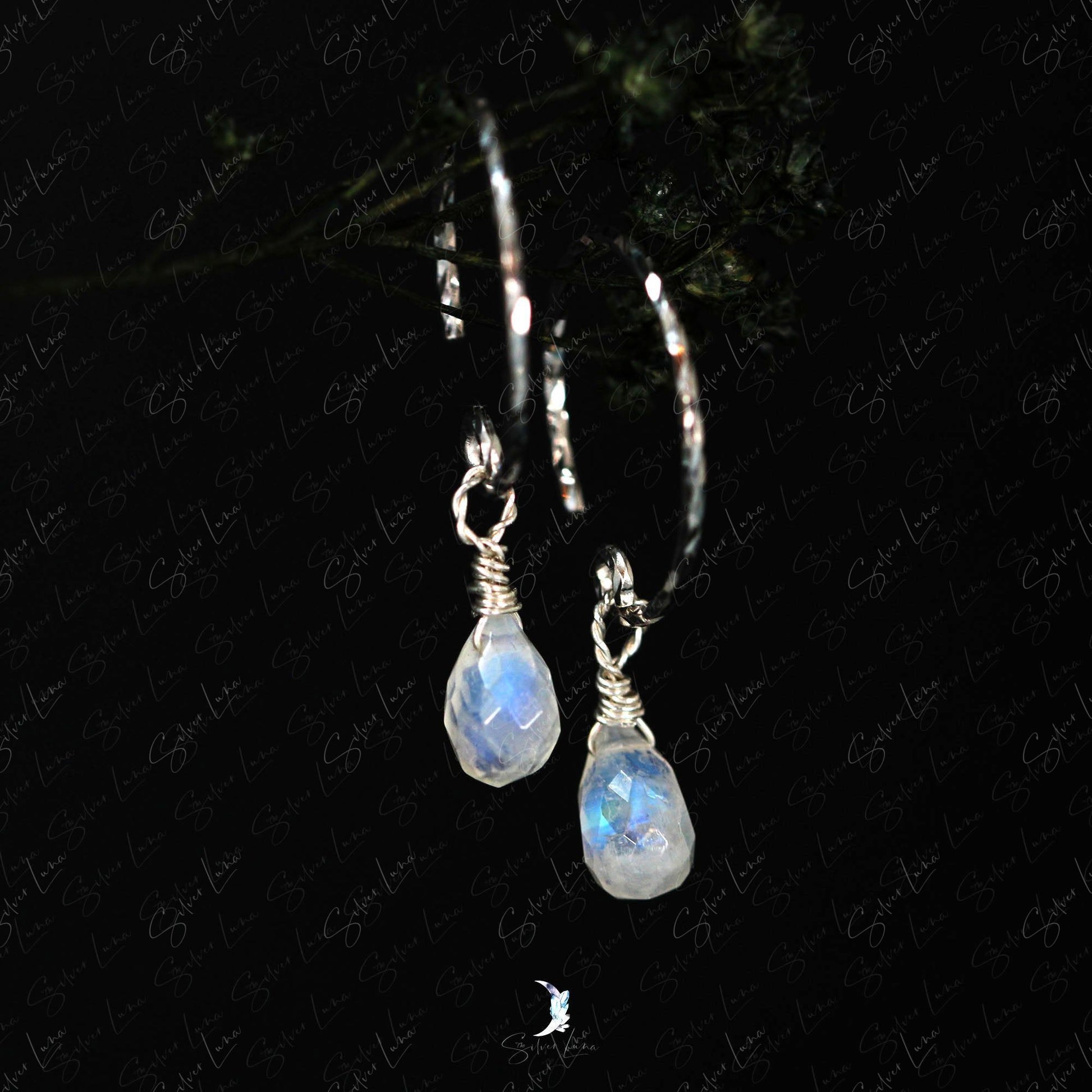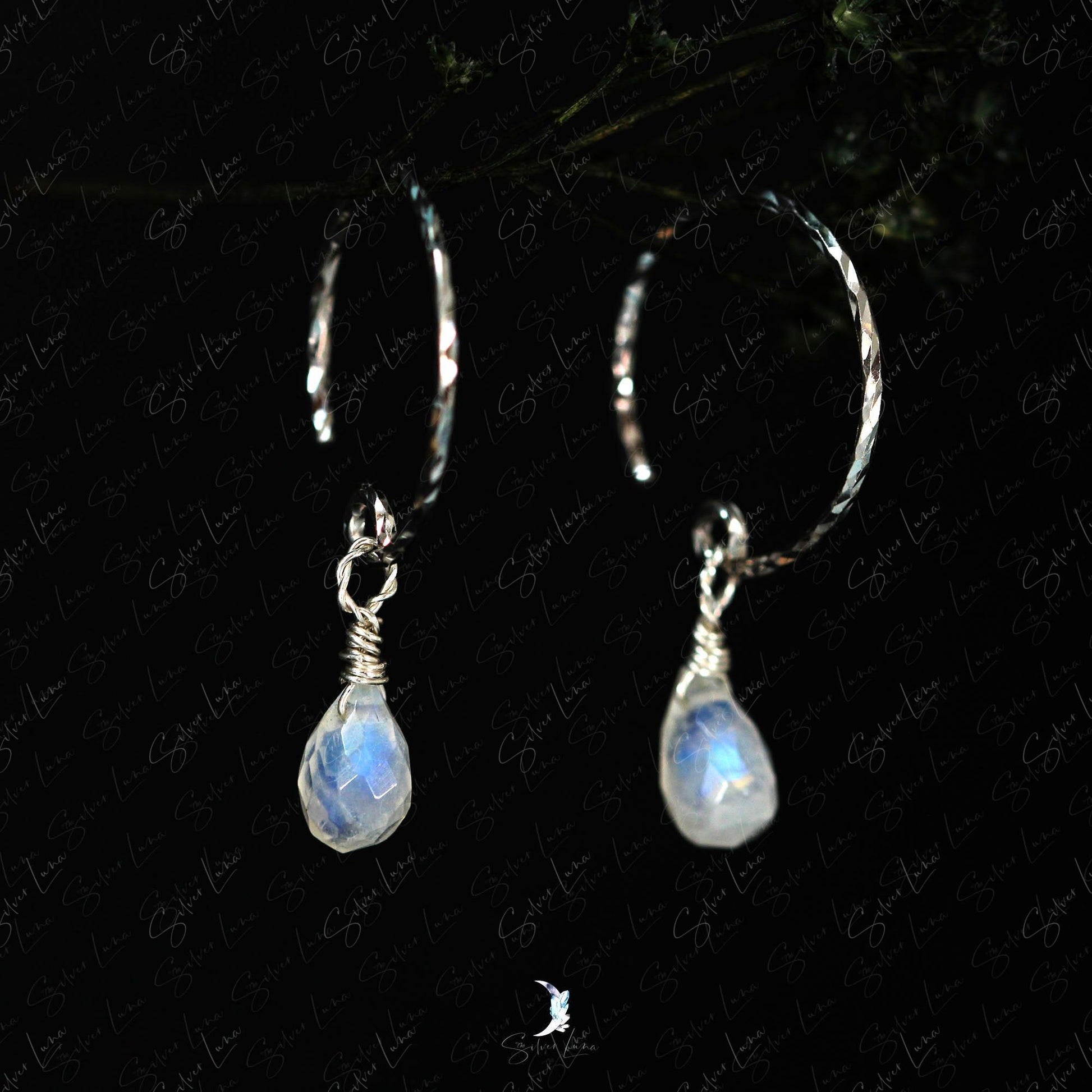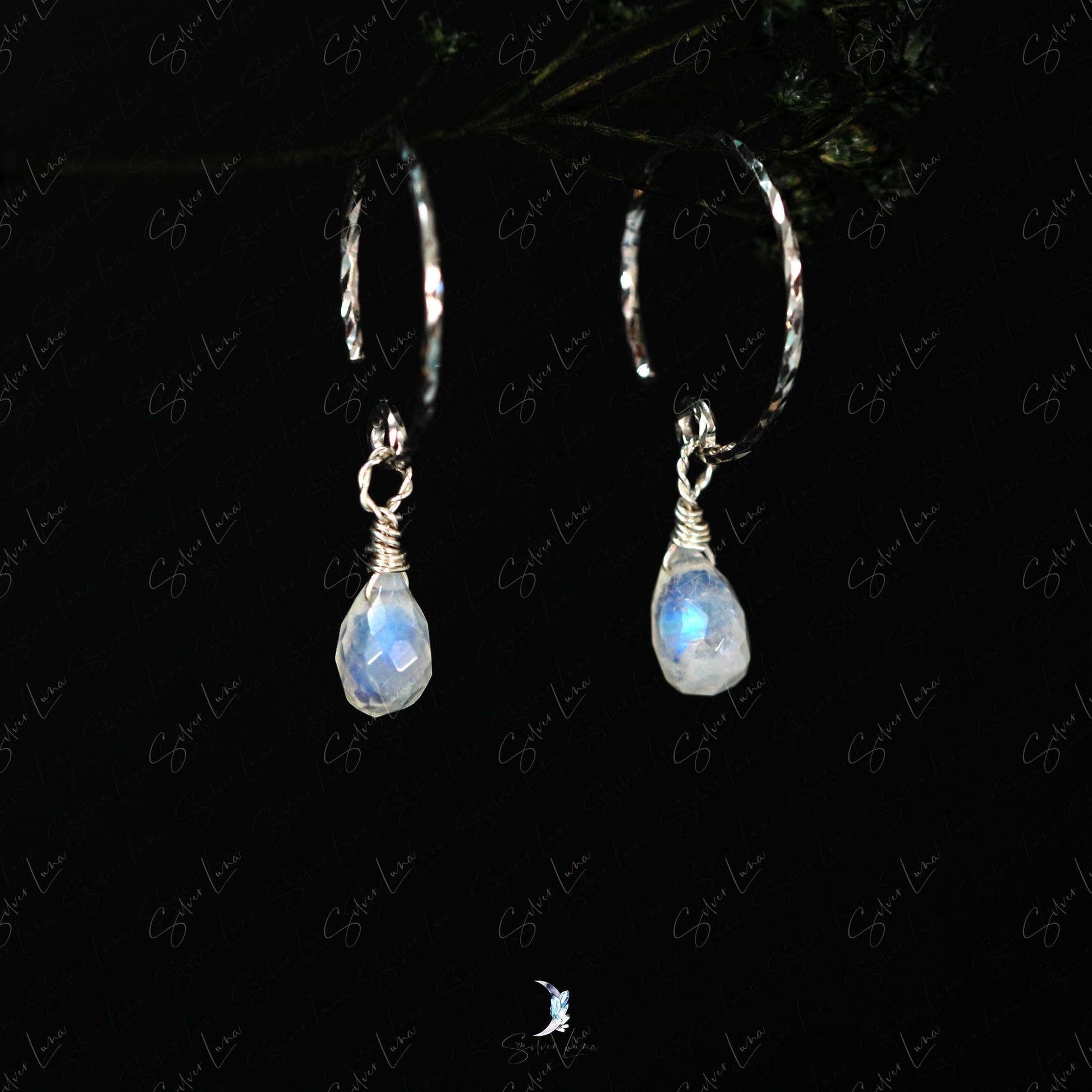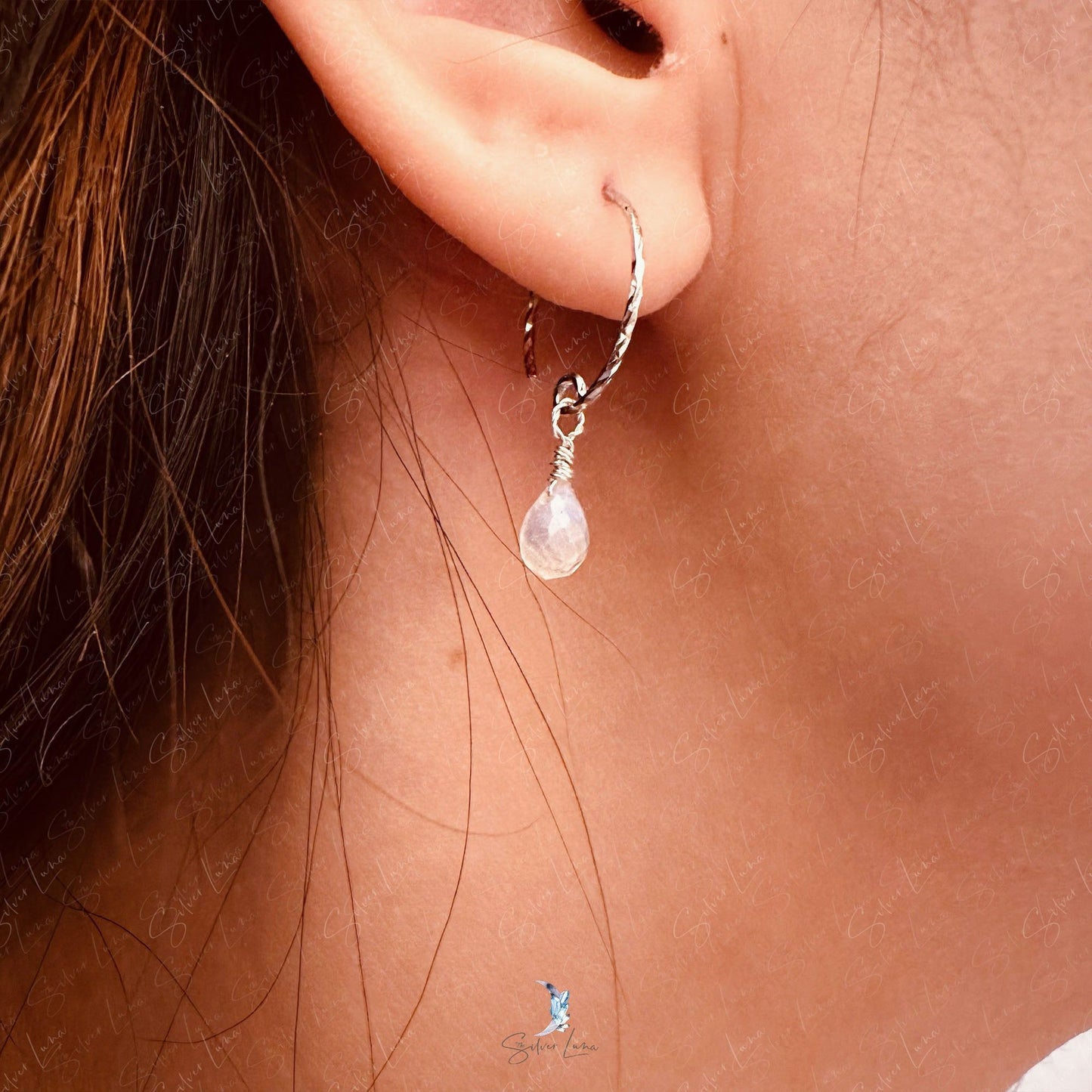 Stunning teardrop moonstone earrings with a minimalist design. Delicately crafted from textured 925 sterling silver ear wires, these earrings feature a tiny teardrop moonstone. Add them to your fine jewelry collection or gift them to a loved one to elevate your everyday look.