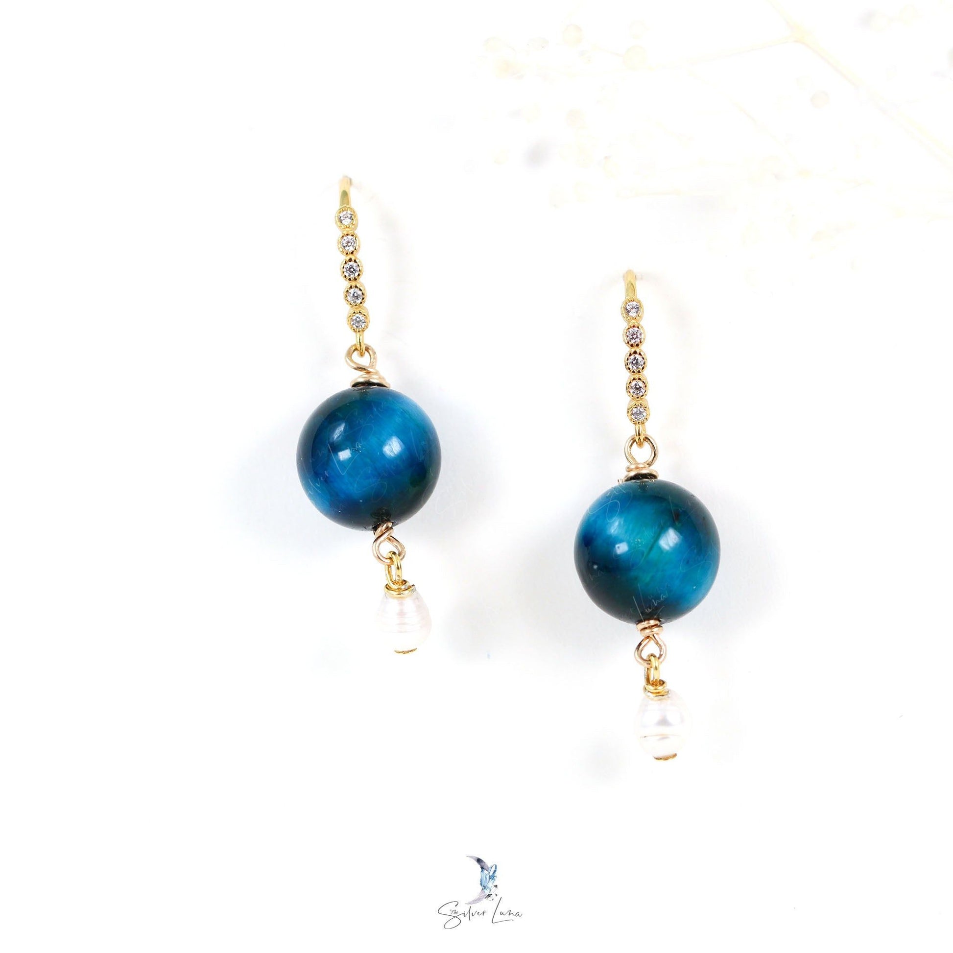 Indulge in the exquisite and one-of-a-kind charm of these Tiger's eye and pearl drop earrings. The breathtaking blue Tiger's eye bead stone dangles gracefully from a freshwater rice pearl and a sparkling cubic zirconia gemstone-embellished ear wire. Crafted with solid 925 sterling silver and gold plating, these earrings are a must-have for any fine jewelry collection or a meaningful present for a loved one
