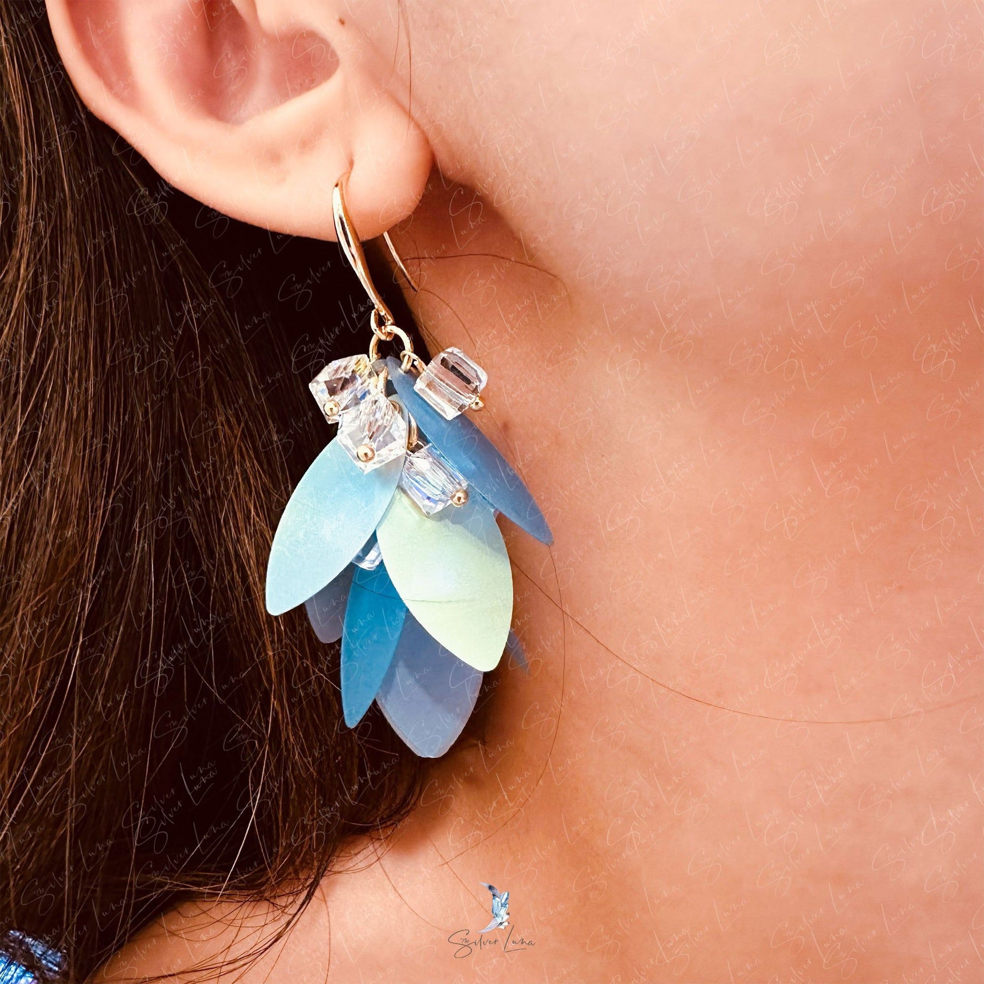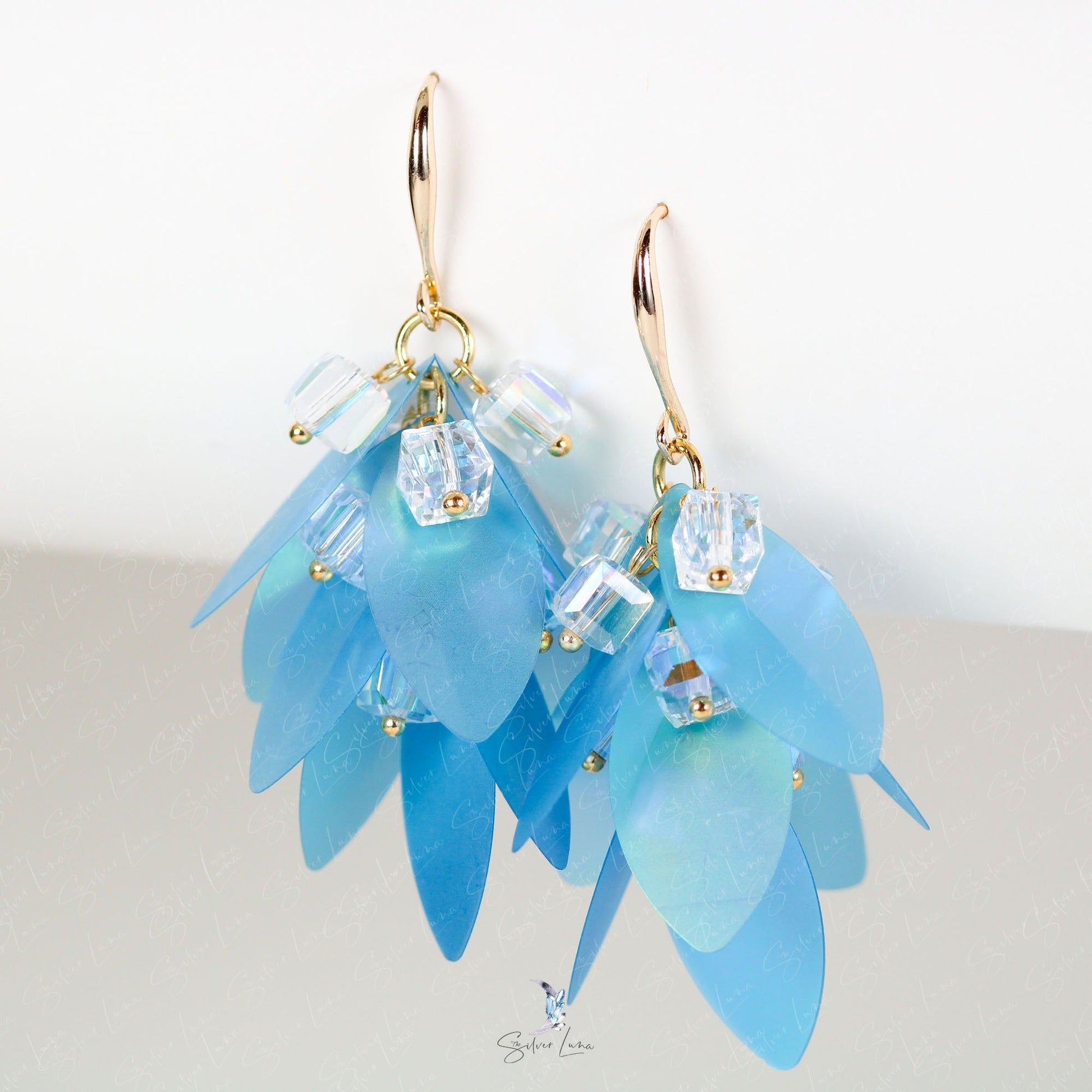A luxury pair of elegant crystal and translucent blue leaves dangle drop earrings, feature 18k gold plated copper ear wires and metal parts, high quality aurora crystal, translucent plastic leaves.