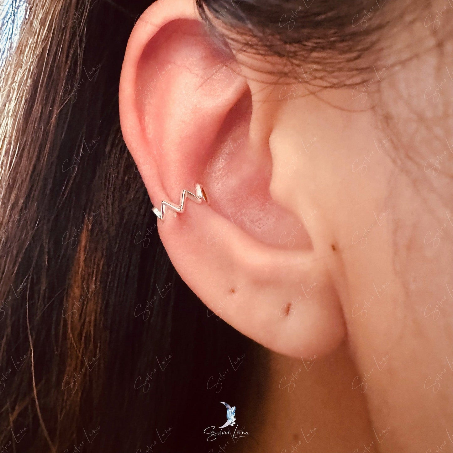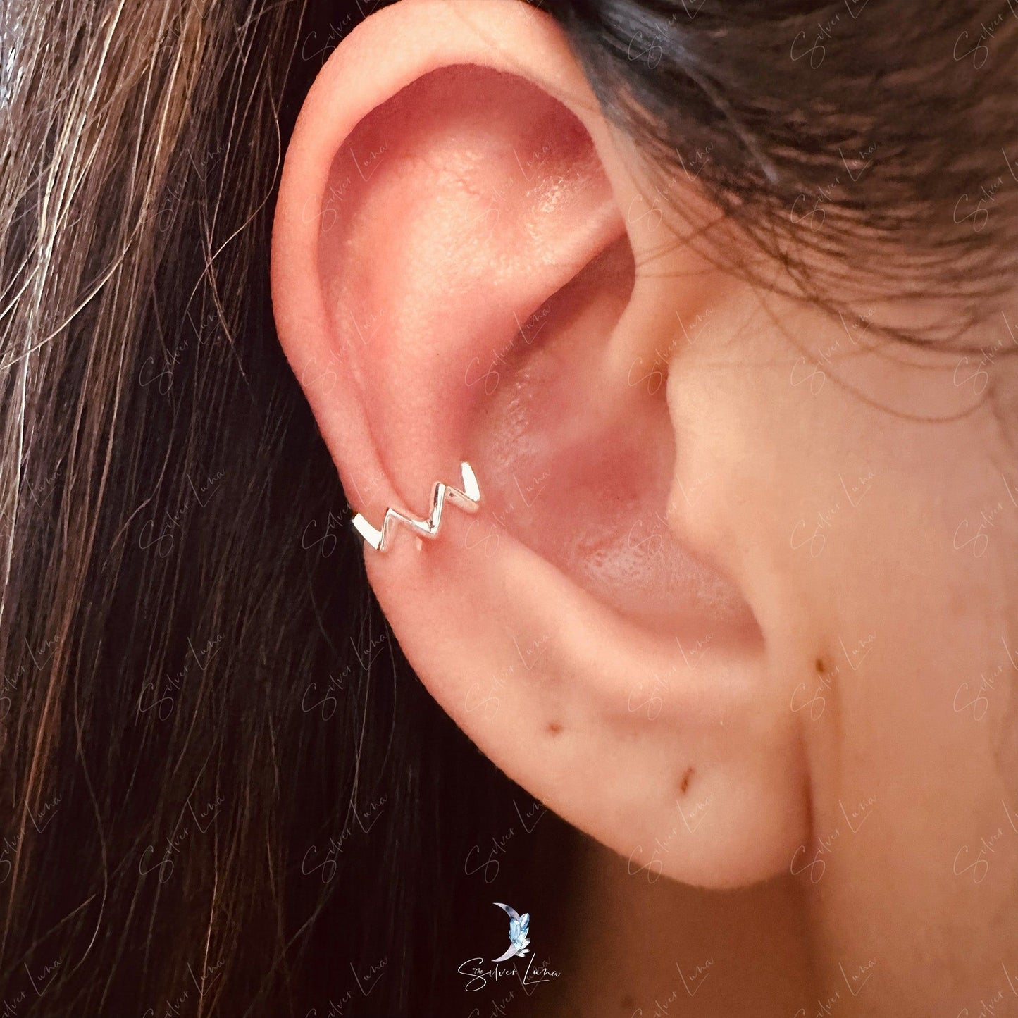 Elevate your look with these stunning silver ear cuffs! Made of solid 925 sterling silver with a stylish zig zag wave design, these cuffs add a touch of personality to any outfit. With platinum plating for long-lasting shine, these cuffs are perfect for small ears and provide the right amount of sparkle to any part of your ear. Don't miss out on these unique and versatile pieces that are sure to make a statement!